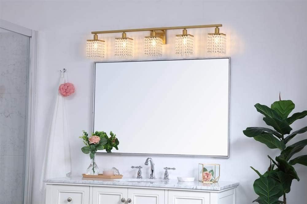 Features Constructed from iron Elegantly decorated with Clear Royal Cut crystals (5) 40 watt maximum candelabra (E12) bulbs required Dimmable with compatible dimming bulbs ETL rated for dry locations Dimensions Height: 8-3/8" Width: 42" Extension: 5-13/16" Product Weight: 6.1 lbs Backplate Height: 4-13/16" Backplate Width: 13/16" Backplate Depth: 4-13/16" Electrical Specifications Number of Bulbs: 5 Max Watts Per Bulb: 40 watts Bulb Base: Candelabra (E12) Bulbs Included: No