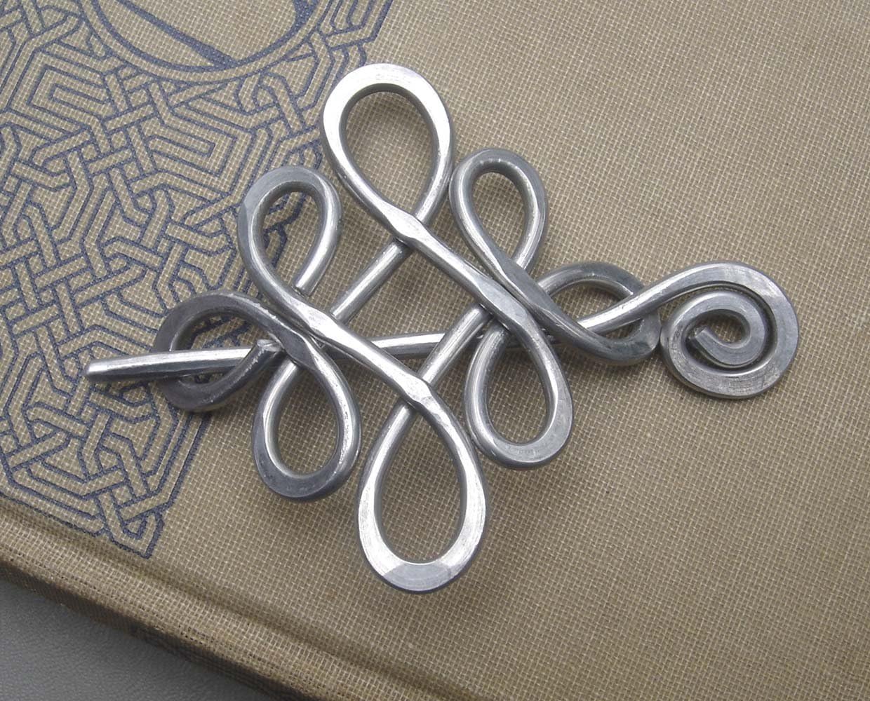 We designed, hammered and twisted 1/8" diameter aluminum wire to make this unique shawl pin, scarf pin, sweater fastener or brooch. Aluminum makes it much lighter than it appears. Really!This pin would work best on a knit or crocheted open weave type garment and is NOT intended for tightly woven cloth fabric.The stick is 1/8" thick and will make a hole in tight fabric. You can gently bend the outer edges of the main piece to create a looser or tighter fit with the pin. Although we hammer the metal to give it extra rigidity and strength it is still quite bendable and malleable and may not work well for hair if you are using it as a hair pin.It only holds a small amount of hair depending on the kind of hair you have. The pin measures about 2 1/8 - 2 5/8 "(5.3 - 6.8cm) long and about 2 - 2 5/8" (5.1-6.8 cm) across the widest part. The stick pin part with the spiral on top that slips through the main design to secure the pin is about 3 1/4 - 3 7/8" (8.2 - 9.8cm) long. Every item is handmade by us so there are some slight variations in size which is why we give the range of sizes the item will be. It is helpful to pull out a ruler when you read the measurements so that you can get a true sense of size since it's often hard to tell just from photos.Sometimes a gray mark may be left on the exit and entrance points of the pin on a light colored garment due to the abrasive nature of wool and other fabrics on aluminum. Aluminum does not tarnish like silver does. It may become a little duller over time. It can be washed in soapy water and shined up with a polishing cloth. All our jewelry comes wrapped in colorful tissue paper, in a nice gift box and tied with a bow ready for gift giving.