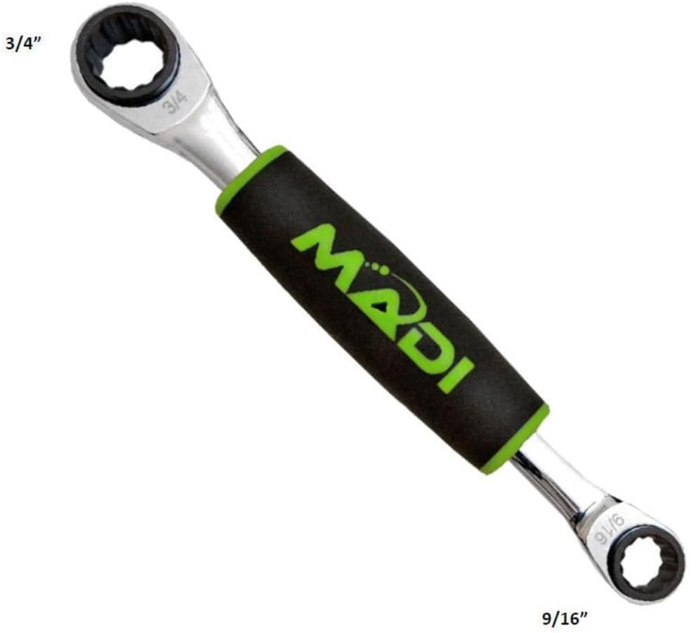 The Madi RW2 lineman speed wrench is a high-performance tool designed for efficiency and safety in the field. Featuring 1000V insulation with isolated ends and a non-conductive grip, this wrench ensures reliability during high-voltage tasks. The forged steel construction delivers exceptional durability and a longer lifespan, while the 9/16” and 3/4” twelve-point sockets provide versatility for common applications. This speed wrench has a finger lip starter which allows for quick and easy engagement of nuts, streamlining the transition to ratcheting. The ergonomic handle with over-mold enhances grip and comfort, reducing fatigue during extended use. For added convenience, the "OFF" side of the wrench is textured in high-visibility green, ensuring positive identification even in low-light conditions. Built for linemen, the RW2 combines durability, precision, and safety in one indispensable tool.