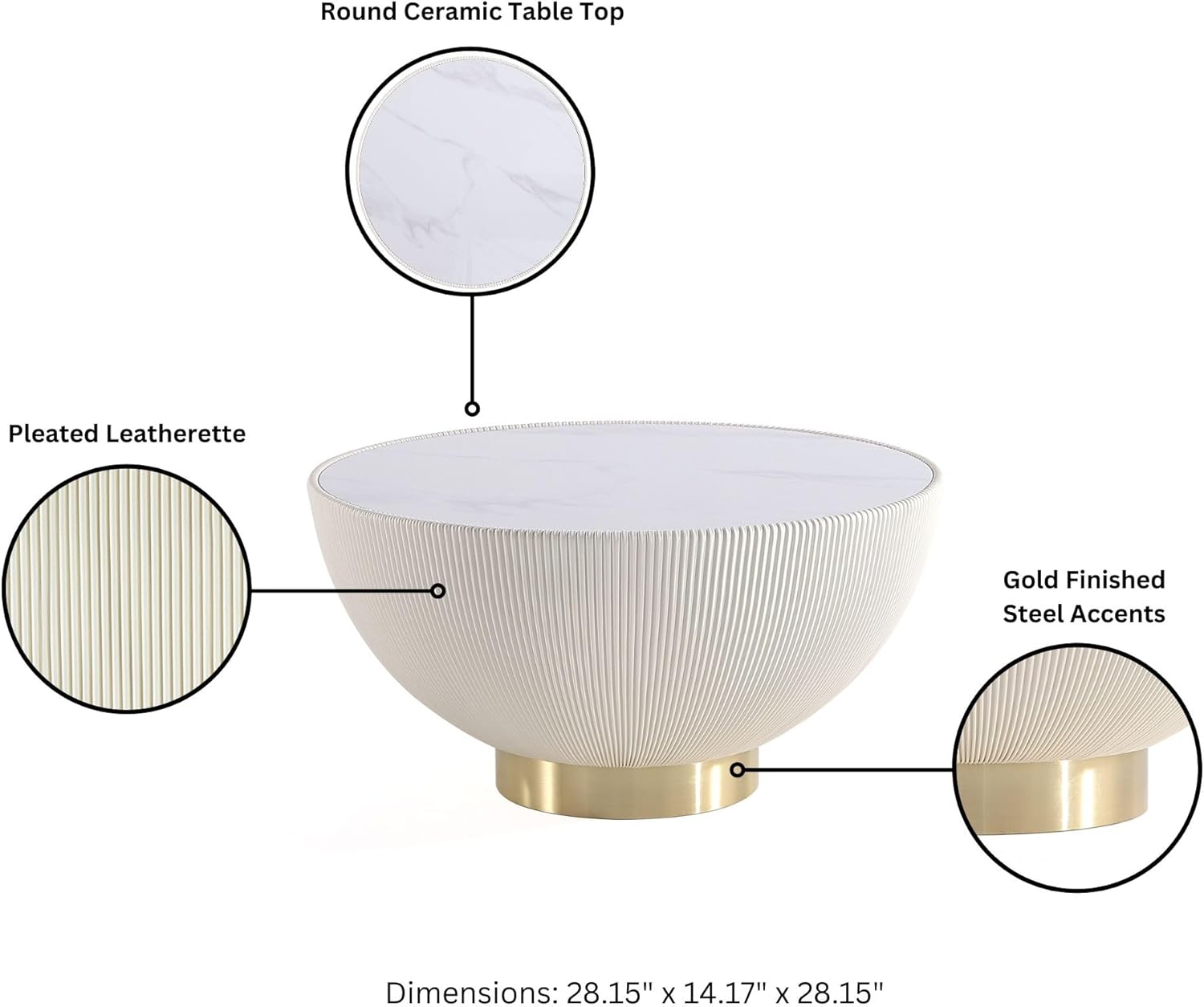 Introducing our striking Modern Anderson End Table, a versatile addition to your living and dining spaces. Crafted with artistic flair, it features unique leatherette pleating and beautiful gold metal finishes that adds a touch of stunning design to your home decor. Built with a high-quality steel frame and feet, this table effortlessly combines style and durability. Pair it with our Manhattan Comfort Coffee Tables to create a cohesive and stylish look, making your living and dining areas stand out. Modern Anderson End Table 2.0 Upholstered in Leatherette with Ceramic Faux Marble Tabletop •Modern End Table for Living Room Use. •Dimension Measures: 18.43 in Length 17.72 in Height 18.43 in Depth •Beautiful Ceramic Marble Table Top. •Unique Pleated Leatherette Details Bringing Modern Design to Your Home. •Features Modern Round Gold Base. •Tabletop Diameter Measures 18.43 inches. •Mix and Match with Manhattan Comfort Coffee Tables. •Delivered to you Fully Assembled! No Assembly Required! Modern Anderson End Table 1.0 Upholstered in Leatherette with Gold Tabletop •Modern End Table for Living Room Use. •Dimension Measures: 15.75 in Length 21.61 in Height 15.75 in Depth •Beautiful Round Gold Steel Table Top. •Unique Pleated Leatherette Details Bringing Modern Design to Your Home. •Features Modern Round Gold Base. •Tabletop Diameter Measures 15.75 inches. •Mix and Match with Manhattan Comfort Coffee Tables. •Delivered to you Fully Assembled! No Assembly Required! Modern Anderson Coffee Table Upholstered in Leatherette with Ceramic Faux Marble Tabletop •Modern End Table for Living Room Use. •Dimension Measures: 28.15 in Length 14.17 in Height 28.15 in Depth •Beautiful Ceramic Marble Table Top. •Unique Pleated Leatherette Details Bringing Modern Design to Your Home. •Features Modern Round Gold Base. •Tabletop Diameter Measures 28.15 inches. •Mix and Match with Manhattan Comfort End Tables. •Delivered to you Fully Assembled! No Assembly Required!