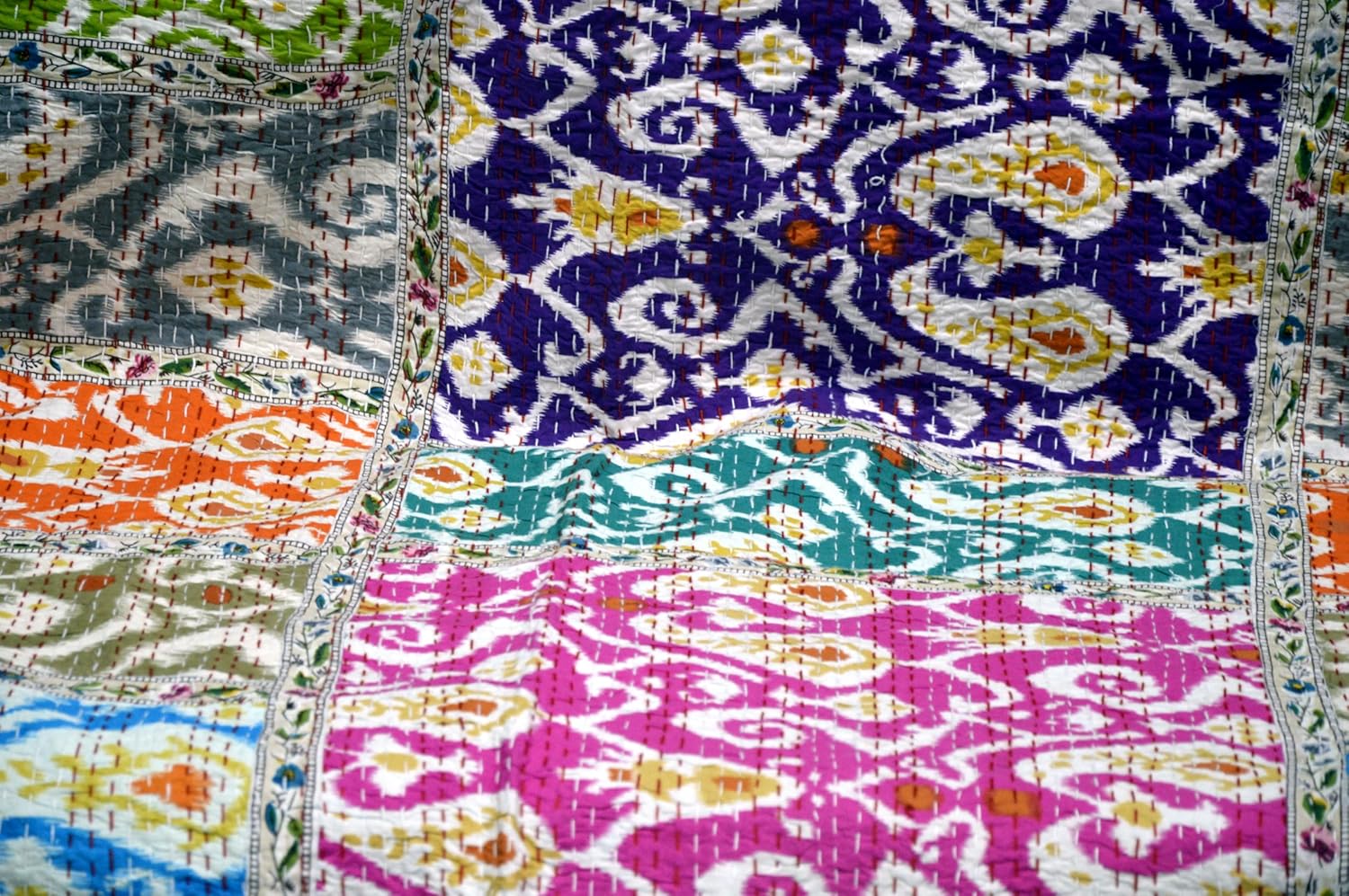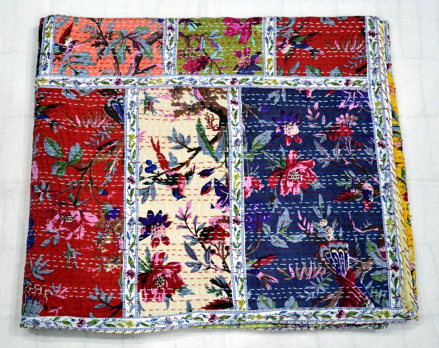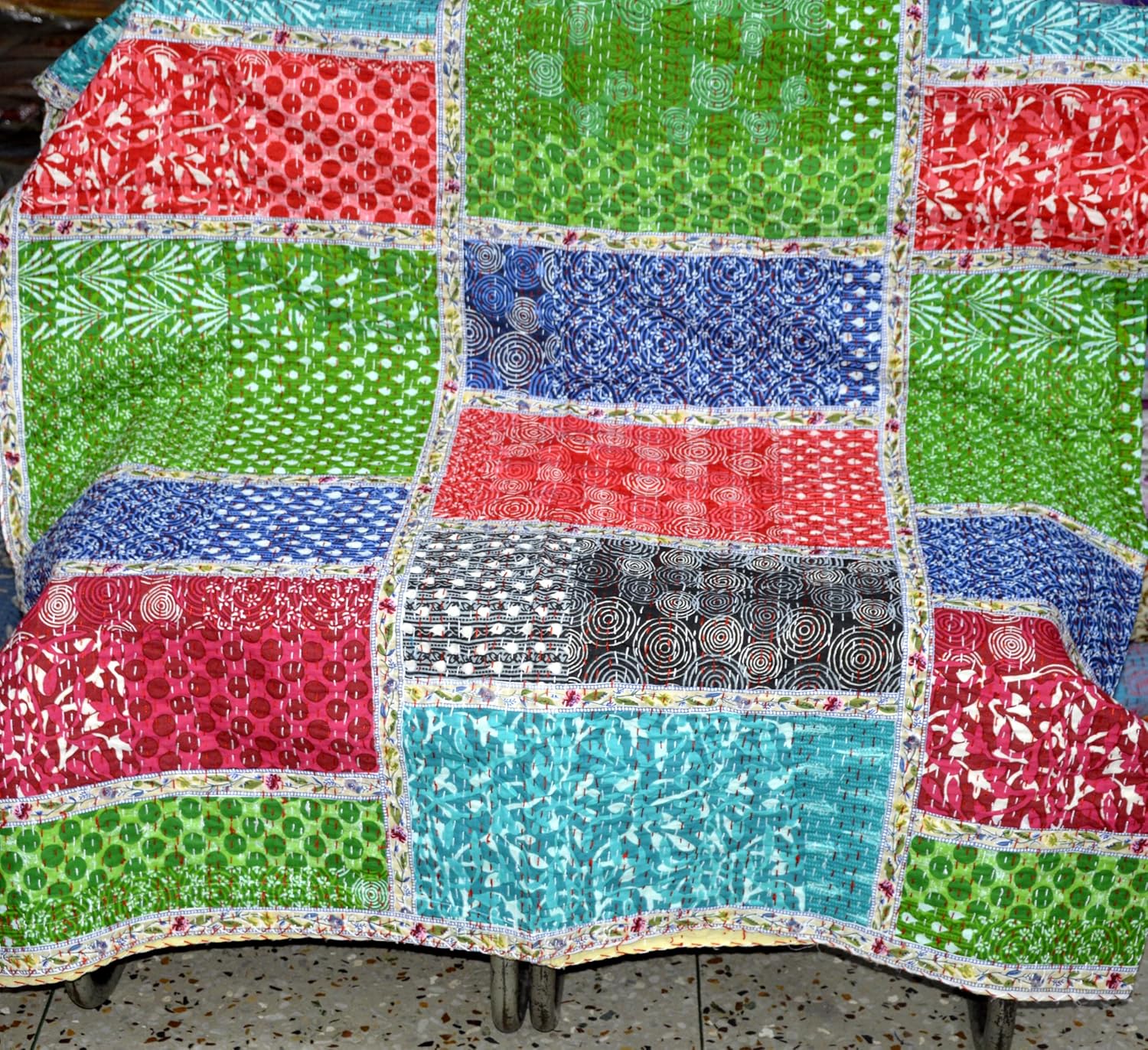 This Indian vintage kantha cotton quilt is completely hand stitched by Women artisan in Rajasthan, India. Kantha is a uniquely quilted texture made from layering colorful vintage. These quilts are famed and admired due to their Kantha work. Add classic style and elegance to your bedroom with a solid quilt set that comes in two patterns and an array of colors. They have different beautiful warm and charming colors, designs and patterns on either side which gives a distinct look. A beautiful creation to give your home a traditional yet authentic colorful. This mandala coverlet is reversible with contrasting vibrant patterns and colors. This kantha quilts can be used for bed covering to wall decorations, bedspread, blanket, bed-cover, quilt, throw or wall hanging. Quilts are made with quality fabric and are reversible which can be used from both sides.