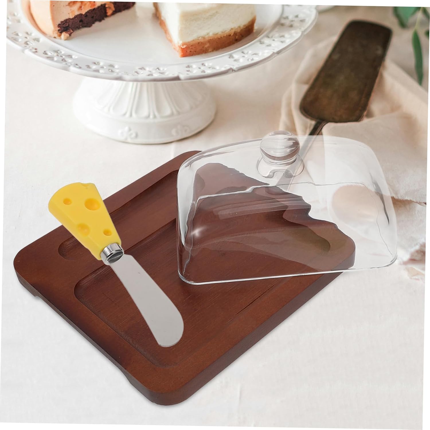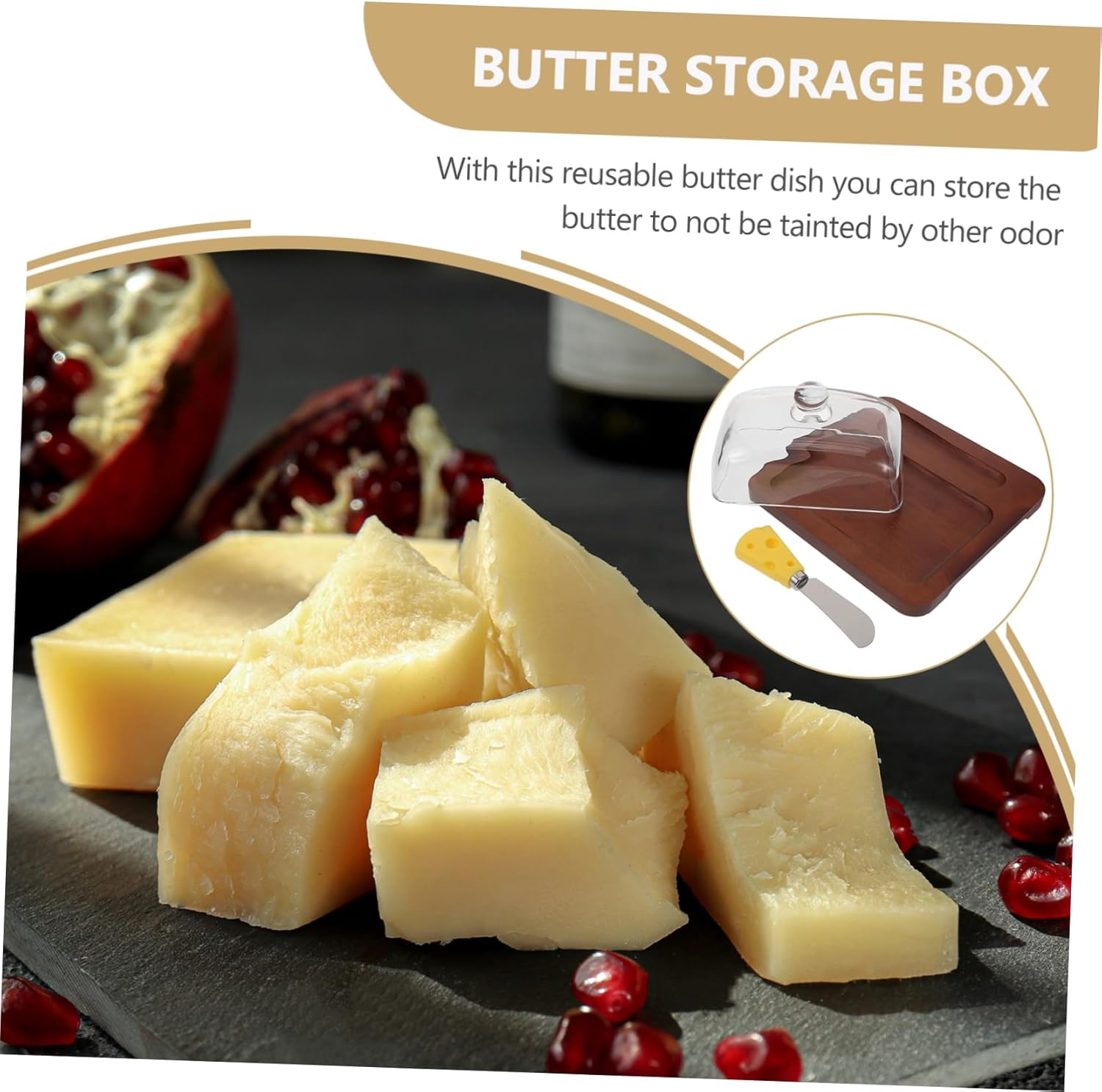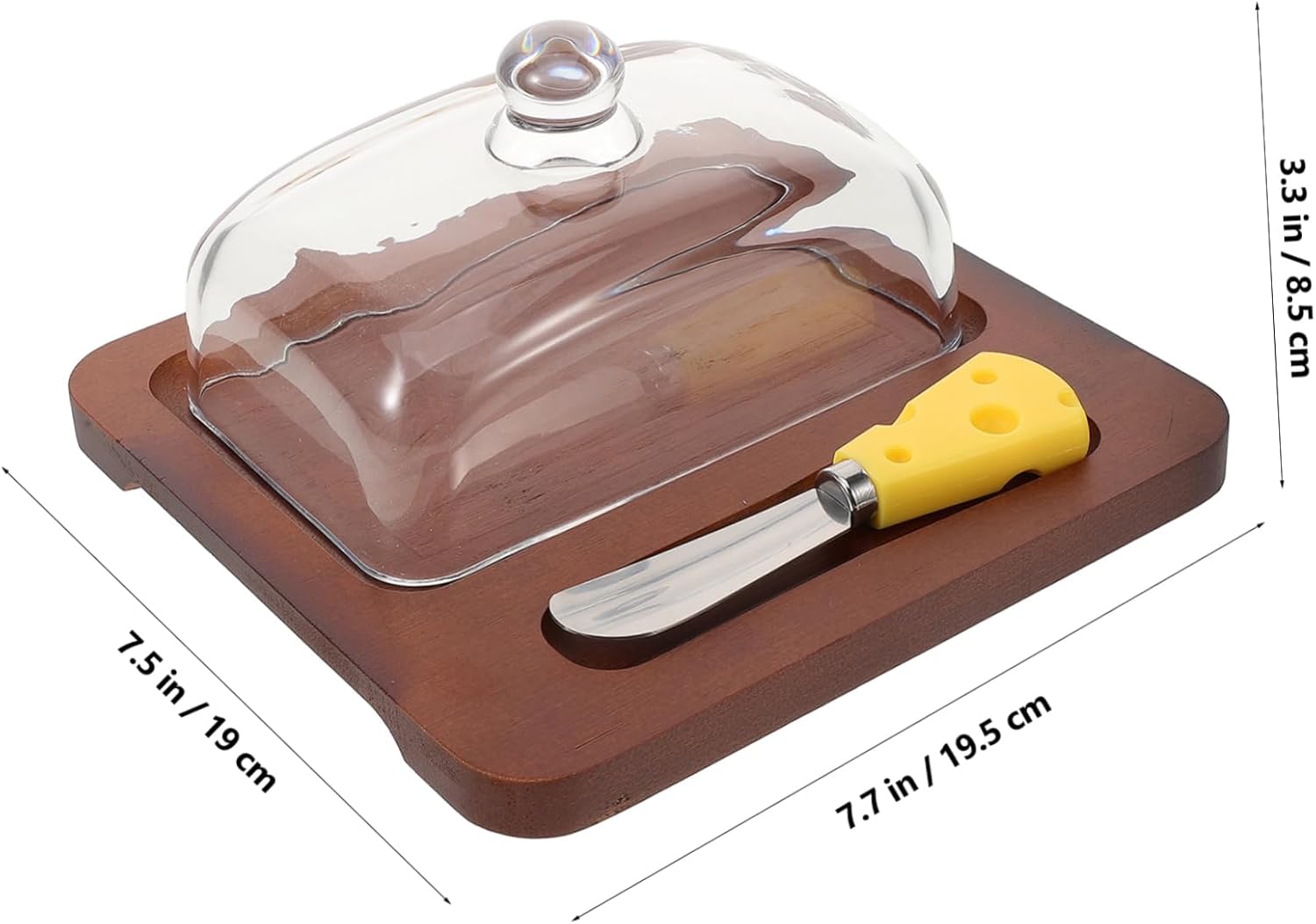 Package List 1 x butter tray 1 x dome 1 x cutter Features -Material:Wood, glass, stainless steel cheese dish - Color: Multi butter Preservation box - Size: 19.50X19.00X8.50cm/7.66X7.47X3.34in 13.00X3.00X1.00cm/5.11X1.18X0.39in butter box with lid - With the lid design, Butter Dish and Lid can keep your cheese or butter clean and safe butter preservation dish. - With this reusable butter dish you can store the butter to not be tainted by other odor butter container. - This convenient butter keeper matches kinds of butter, to satisfy your daily use butter container for fridge. - You will find your kitchen countertop neat and orderly after using it, improving your life greatly butter dish container. - Utility butter dish with sealing lid to keep your butter fresh, provides a natural style for your kitchen butter cutting tool.Goods Descriptionbutter container for fridge Let this butter storage box be the stylish kitchen utensil you could ever have.butter dish with lid You can use it to store any type of solid butter or cream cheese.home tableware Household Butter Storage Box, with a sealing cover and a cutting tool for convenient use