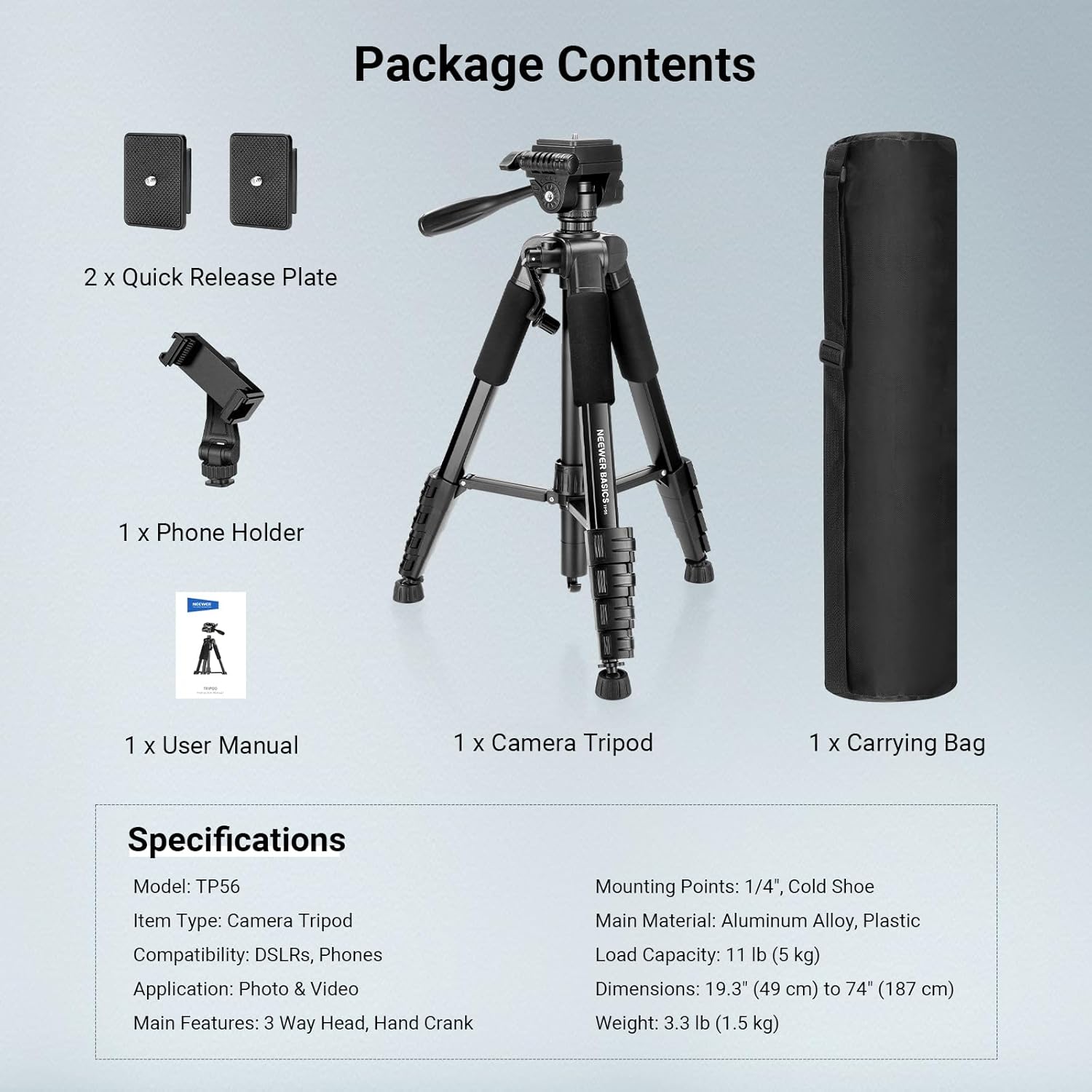 | BuiltIn Media | 1 x Camera Tripod 2 x Quick Release Plate 1 x Phone Holder 1 x Carrying Bag 1 x User Manual |