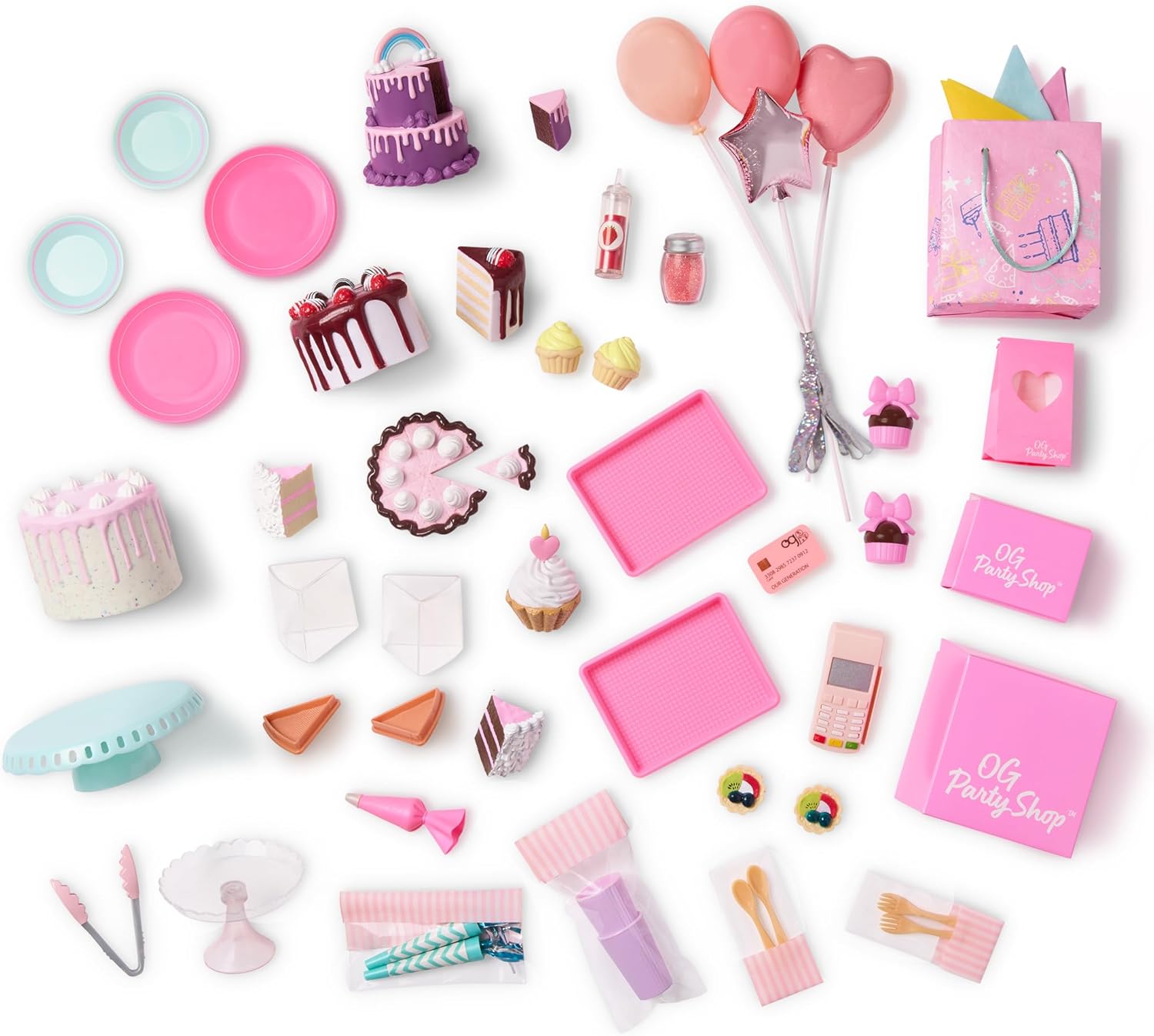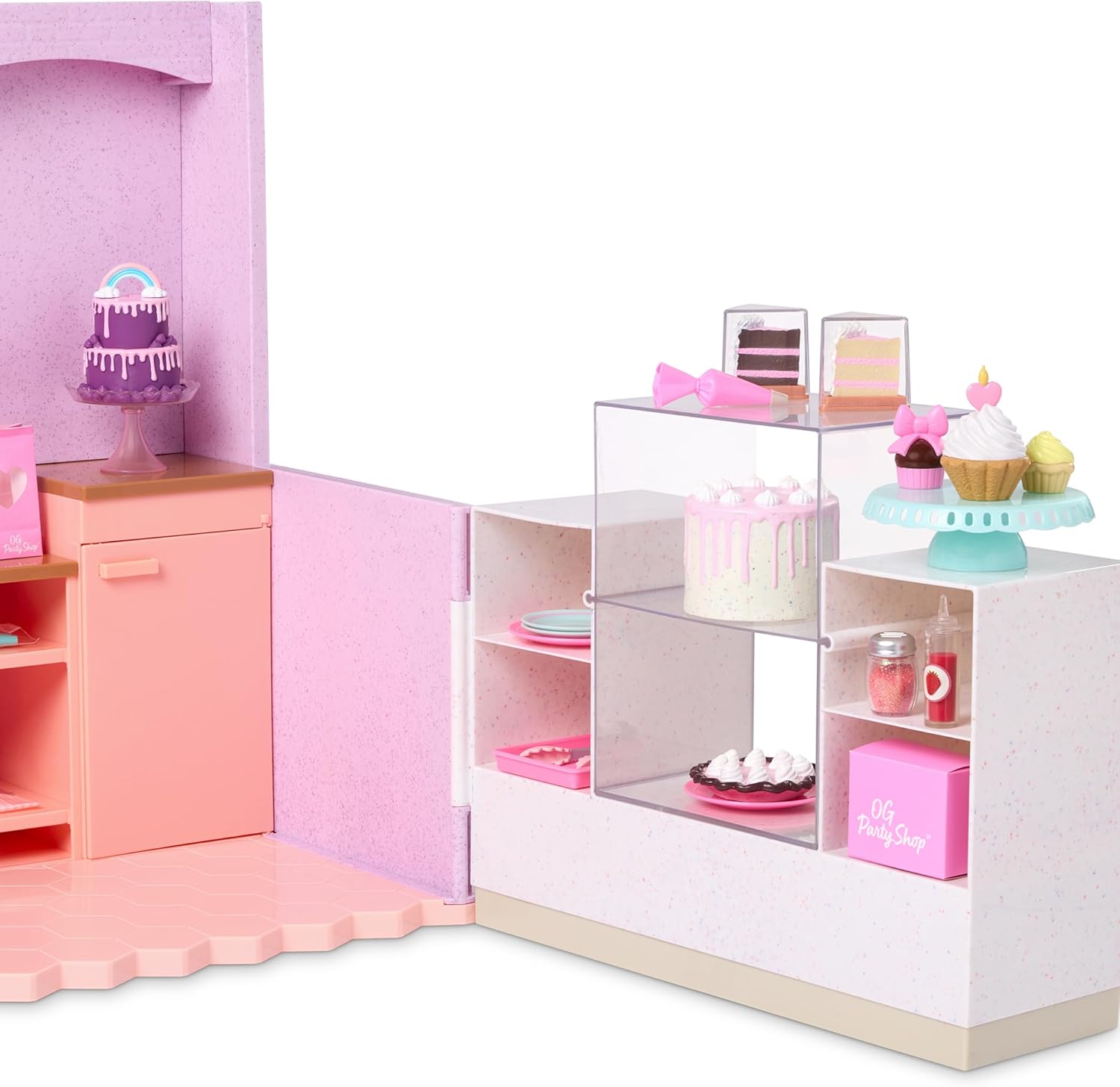 Turn every day into the ultimate surprise celebration with the Our Generation Party Shop Playset for 18-inch dolls Designed in cheerful colors with an eye-catching pink balloon arch, this unique set has everything kids need to run their own party store as they prepare for more fun-filled birthdays and events. At the heart of this set is a charming display area with a mini refrigerator, shelf and folding counter to display over 15 dessert items. Includes cupcakes, cakes, fruit pies and a scented cake that really smells like delicious chocolate. Individual slices also mean kids can share every detailed gift with party guests, while the birthday cupcake makes each doll's big day more special. Plus, pretend decorating and serving is even more appealing with a piping bag, sprayer, strawberry syrup bottle, and takeout boxes to take the fun on the go. Ready to complete your order? A themed gift bag and party items like spoons, forks, cups and plates are neatly packaged to put the finishing touches to every party scene. And it comes with a payment terminal and credit card that add a realistic touch to the storytelling. The Our Generation Party Shop set makes a wonderful gift for kids ages 3 and up (small pieces), encouraging them to imagine their own unique stories. Compatible with most 18-inch dolls and accessories. Our Generation dolls are sold separately.