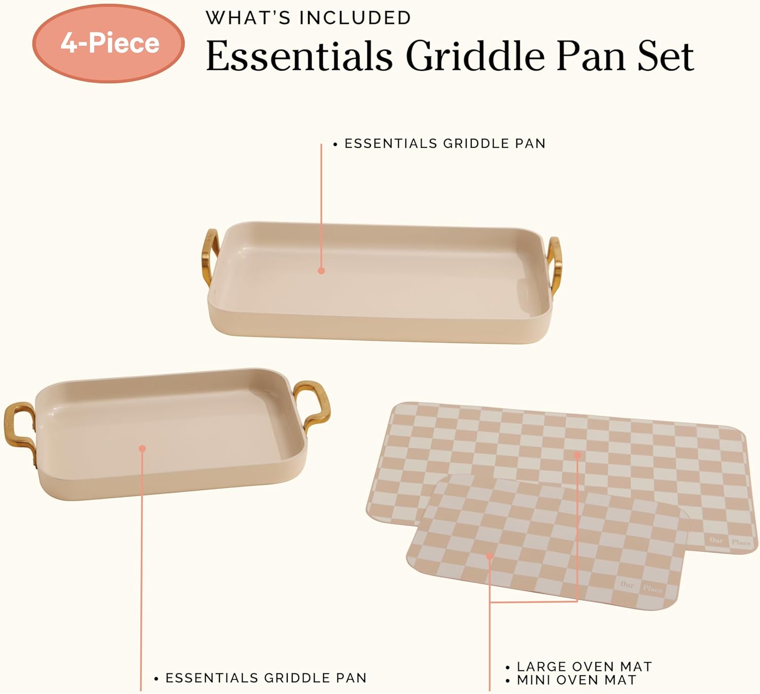 Meet the Essentials Griddle Pan Set (4-Piece) from Our Place, a compact yet powerful addition to our best-selling Essentials line. This stovetop-to-oven duo is designed for weeknight ease and weekend creativity, giving you the flexibility to griddle, roast, and bake using one streamlined system. With two griddle sizes and reusable silicone mats, you can cook, serve, and clean up beautifully — no parchment paper required. Featuring Thermakind ceramic nonstick coating, each piece is free from PFAS, PTFE, lead, and cadmium — ensuring your meals are as safe as they are delicious. The cast aluminum construction delivers fast, even heat across the cooking surface, and the oven-safe design (up to 450°F) makes transitions seamless from stovetop to oven to table. Whether you're flipping pancakes, crisping smash burgers, or roasting vegetables, everything cooks evenly with effortless food release and quick cleanup. Thoughtfully designed to fit your kitchen, the set includes the full-size Essentials Griddle Pan, the Mini Griddle Pan, and two reusable silicone mats that nest neatly inside for space-saving storage. Finished with a smooth, modern exterior and easy-clean surfaces, it’s cookware that performs as beautifully as it looks — because in your kitchen, every meal deserves better.