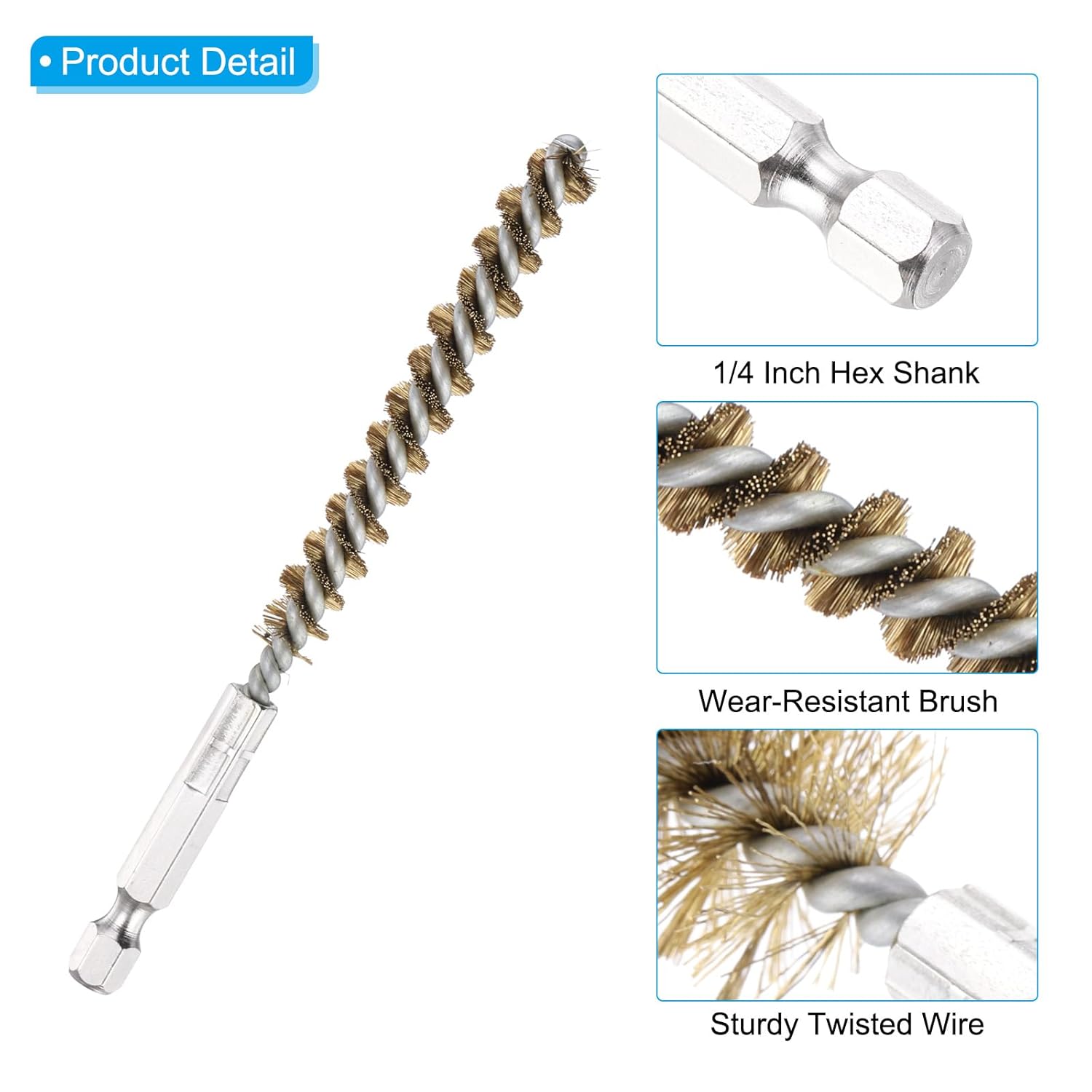 The brass core brush is widely used in automotive, manufacturing, machining, ports, pipes, bearings, etc. It can easily enter the narrow areas, great for cleaning, polishing, and rust removal.SpecificationMaterial: BrassColor: Brass ToneSize: 115 x 8mm/ 4.5 x 0.31 inch (LxD)Brush Length: 70mm/ 2.76 InchPackage List: 4 x Brass Core BrushAdvantageMade of brass material, is sturdy, and wear-resistant. The brush is dense and neat, not easily hair-removing. The twisted wires design enhances the cleaning effects of removing dirt and rust.InstructionThe brass core brush can be directly installed in the power drill or die grinder, or you can install it on the appropriate driver handle for better and more efficient cleaning.NOTEThe brass bore brush is only used in push-pull operations. When operating, the speed should not exceed 600 rpm and should not rotate counter-clockwise.