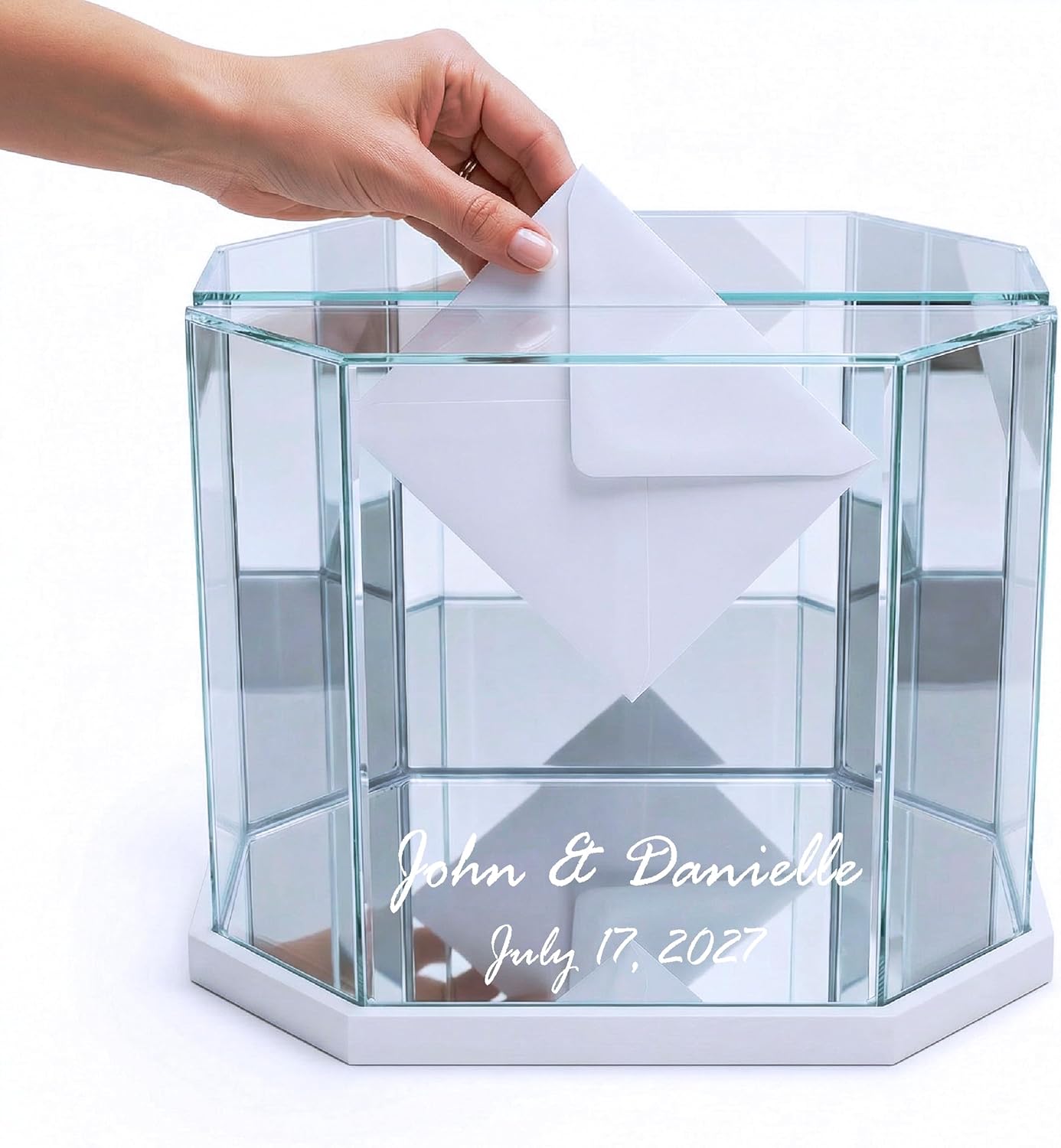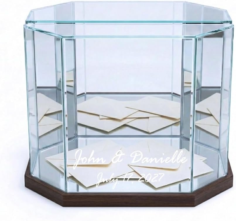 Your wedding day deserves more than a plain box on a table. The Personalized Octagon Glass Wedding Card Box is the only card box that's been designed for two moments at once — your reception, and every year that follows. On your wedding day, it serves as a stunning centerpiece. The real glass panels, mirrored base, and mirrored back panels catch the light beautifully as guests drop in their cards and envelopes through the top slot. The hinged lid opens at the end of the night so you can collect everything inside. Your names and wedding date are engraved directly into the frame, making it unmistakably and permanently yours. But here's what makes this box truly different: it doesn't go in a closet after the wedding. The octagon design and glass construction make it a natural display case — one that can hold your wedding invitation, a photo, dried florals, your vows, or any small piece of memorabilia from your most important day. It becomes a living piece of your home and your story. Choose from eight frame finishes — black, white, grey, dark brown, light brown, natural, silver, or gold — to match your wedding aesthetic and your home's style for years to come. Each box is made to order and engraved with care. This is not just a wedding accessory. It's the beginning of a display you'll keep forever.