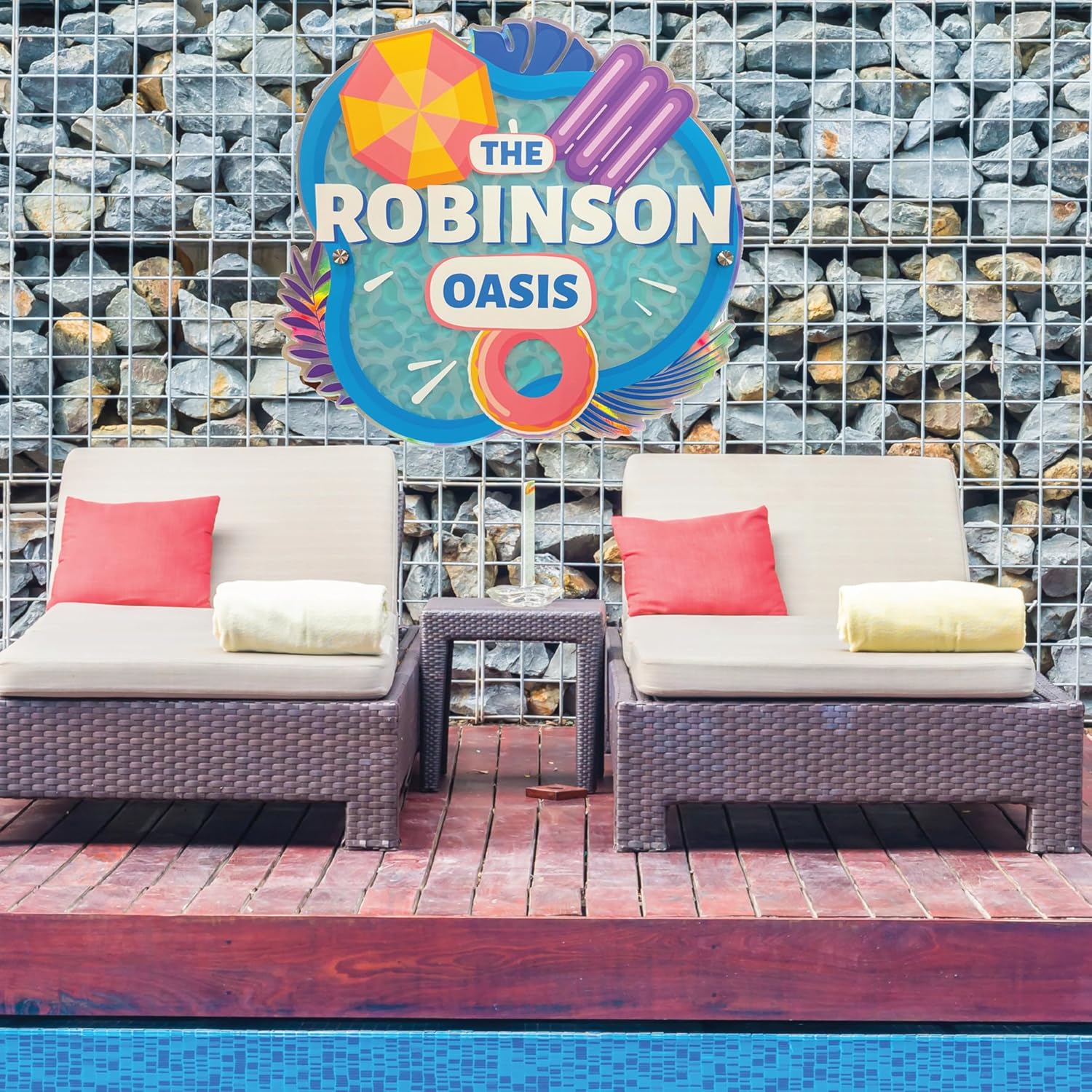 Create a one-of-a-kind gift with our customizable pool sign featuring a stunning aqua holographic background. Perfect for your home swimming pool, this sign is crafted from UV-protected, 6mm thick acrylic with rust-resistant, long-lasting vinyl backing. Made in Orlando, Florida, USA, at our family shop, this durable sign is fade-resistant, weatherproof, and designed for both indoor and outdoor use. Rounded corners ensure safety, while pre-drilled holes and included metal standoffs make mounting effortless on walls, posts, or other surfaces. This eye-catching sign is ideal for birthdays, housewarmings, weddings, or as a thoughtful Christmas gift. Personalize it with your family name for a unique decorative touch.