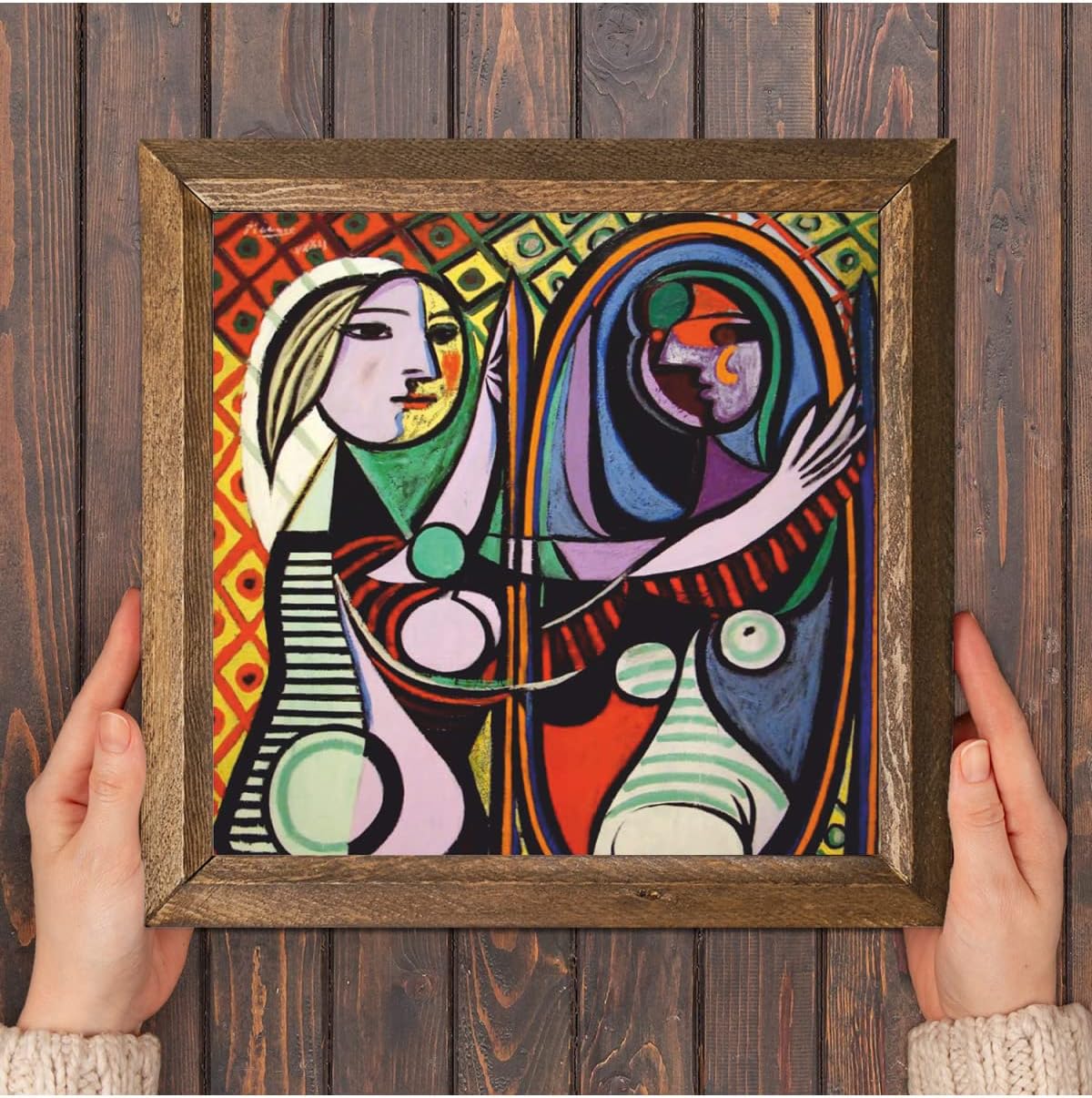 Pinecone Pablo Picasso Girl Against Mirror Stone Wall Painting - Wood Framed Stone Painting - Natural and Modern Stone Wall Decor If you are looking for an elegant and eye-catching decoration that will change the atmosphere of your home or office, the Wood Framed Stone Painting is for you! This unique set combines the authentic texture of the natural stone and the warmth of the high-quality wood. Each painting is provided in size 25x25cm. The frames are made from 100% natural premium wood and are fully handcrafted. This not only increases the durability of the product but also gives each piece a unique aesthetic. Wooden frames combine perfectly with modern decoration trends, while highlighting the details of the lithograph. Natural Materials: Natural indentations and bumps in the grain of the stone make each painting unique. The frames have a unique look with natural wood grains. Modern & Minimalist Design: Can be used in different areas such as home, office, restaurant or hotel. Easy to Install: Each painting can be easily mounted on the wall thanks to the sturdy hanging brackets on the back. Alternatively, it also offers the possibility of fixing with double-sided tape. Durable and Eco-Friendly: Made with natural materials such as wood and stone, it is a decoration solution that does not harm the ecological balance. Practical Use: Easy to clean, simply wipe with a damp cloth without chemicals to protect the natural surface of the stone. Experience Quality with Pinecone Brand! Pinecone brings a whole new lease of life into the world of decoration, combining materials such as natural stone and wood. This product offers a unique choice both in terms of aesthetics and durability. You can choose this table set to create a warm, natural and modern atmosphere in your living spaces.