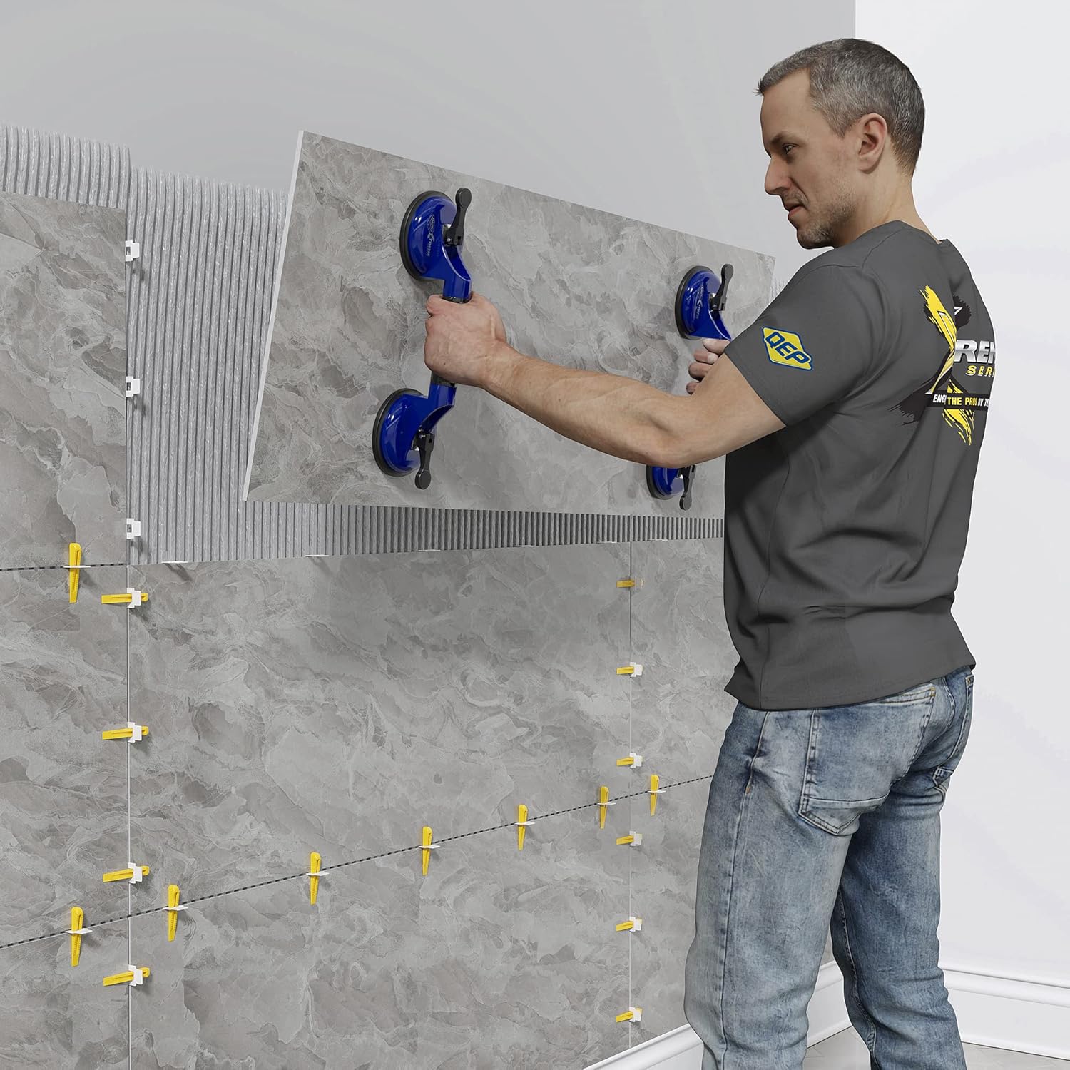 Lift and set tile, marble, granite and glass, with the QEP's Xtreme Series Double Suction Cup. Smooth, non-porous materials up to 200 lbs. are lifted, transported and set into place more easily. The levers over both non-marring rubber pads allow a quick hold and release of the material. Engineered by Ishii, this Double Suction Cup features a rigid aluminum alloy body for a long life. For best results, wipe the tile surface clean before applying, and ensure the suction cup underside is clean and dust-free.