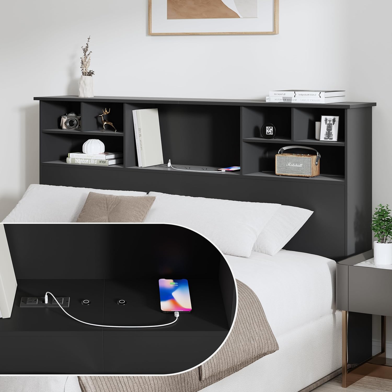Queen Headboard only for Queen/Full Size Bed with Storage, Stylish Queen Size Headboard with USB & Type C Port & 2 LED Lights, Noise-Free Wood Bookshelf headboard, Height Adjustable, Black