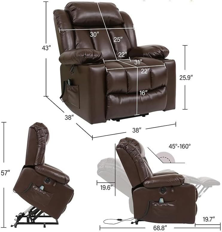 Upgrade your relaxation experience with the PU Leather Electric Power Lift Recliner Chair for Adults, designed to combine style, comfort, and functionality. Featuring a smooth power lift mechanism, this recliner makes it easy for seniors or individuals with mobility needs to stand up or sit down without strain. The adjustable backrest and footrest allow you to find your perfect seating position for reading, watching TV, or simply unwinding after a long day.Crafted with premium PU leather, this chair offers a luxurious look, exceptional durability, and easy maintenance, making it ideal for everyday use. Built-in side pockets and cup holders keep your essentials close at hand, whether it’s your favorite beverage, remote control, or reading material. Perfect for living rooms, home theaters, or entertainment areas, this recliner enhances any space with both comfort and convenience.