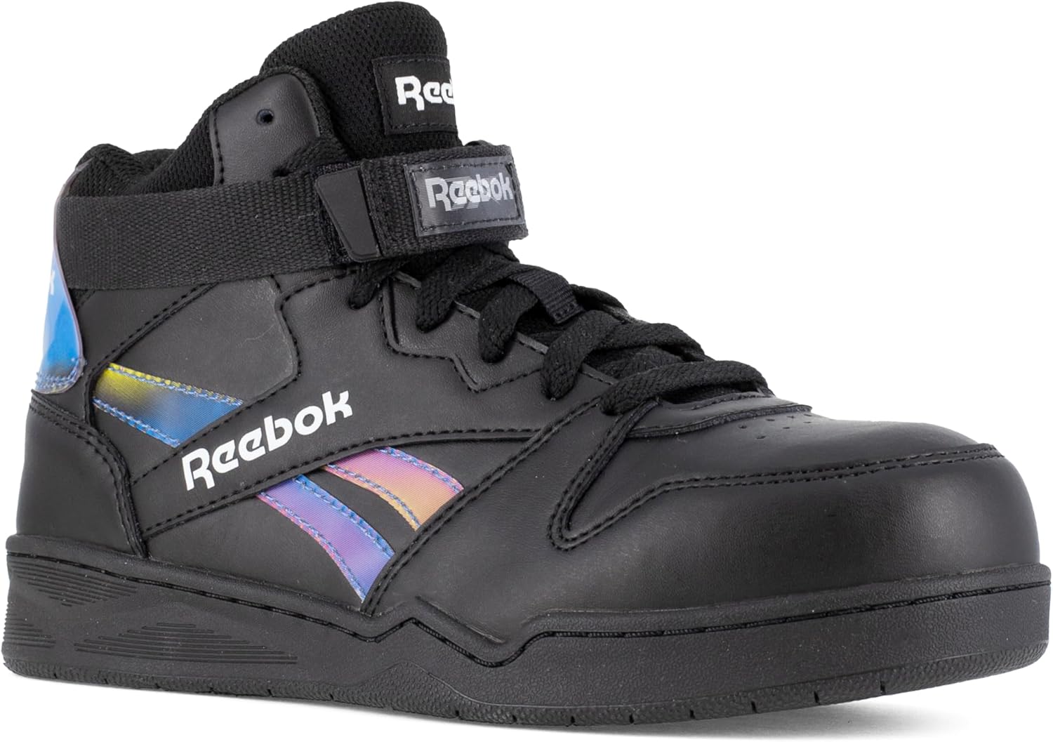 Inspire your work and gain some work cred with your co-workers with these heritage basketball-inspired styles from Reebok's timeless sneaker designs. Show some respect for your work while showcasing these timeless safety styles. With holographic designs and velcro straps, these kicks will keep you protected while bringing an everyday style and class to your job. Footwear Type: High Top Work Sneaker Toe Type: Composite Upper Material: Mesh and Leather Color: Black and Holographic Spectrum Lining: Moisture Wicking Nylon Mesh Insole: MemoryTech Removable Cushion Footbed Outsole: Slip Resistant Rubber Outsole Special Features: 100% Non-Metallic, Extra Wide Toe, 360 Degree Sidewall Stitch, Holographic Designs, Velcro Strap Features: ASTM F2413, Composite Toe, XTR® Brand Composite Toe, Electrical Hazard, SR-ASTM F3445, Metal Free - High top classic basketball-inspired designs with branded holographs offer optimal support and stability - Blended leather and mesh uppers provide heritage comfort and breathability - Durable slip resistant rubber outsole keeps sneakers tough against any work environment - MemoryTech Memory Foam Cushion Footbed adds extra shock absorption and cushion - XTR® brand extra wide composite toe reduces weight while maintaining impact and compression protection (meets or exceeds ASTM F2413) - Slip Resistant bottom meets or exceeds ASTM F3445 standard