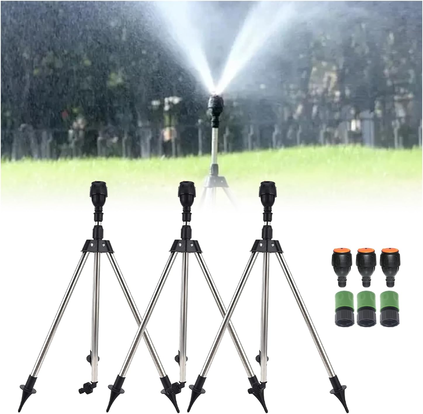 Tripod Automatic Rotating Sprinkler: 1) Effortlessly water your garden with this beautiful & effective sprinkler. Customize your spray area & water only where you want it. 2) Strong and durable tripod structure. 3) 360 degree rotating spray. 4) It is adjustable for varying heights & can be useful in many instances. Specification: Material: Stainless Steel, Plastic Color: As shown Tripod Height: Approx.56cm/ 22in Weight: Approx. 570g/ 20.1oz Rotation Angle: From 30 degrees to 360 degrees. Sprinkler Irrigation Range: From semicircle to circle Adjustable Height: 56-89cm / 22.0-35.0in Package Includes: 1 x Tripod 1 x Watering Nozzle Warm Tips: 1) Please allow slight measurement deviations due to manual measurement. 2) Due to the different monitor and light effect, the actual color of the item might be slightly different from the color showed in the pictures.