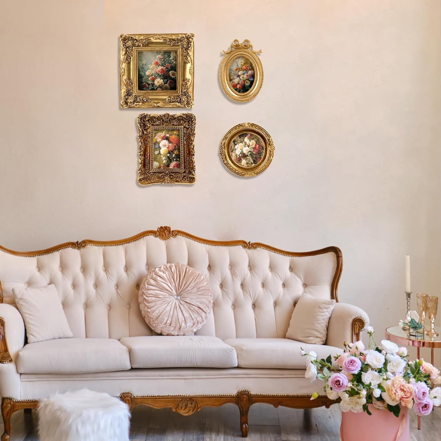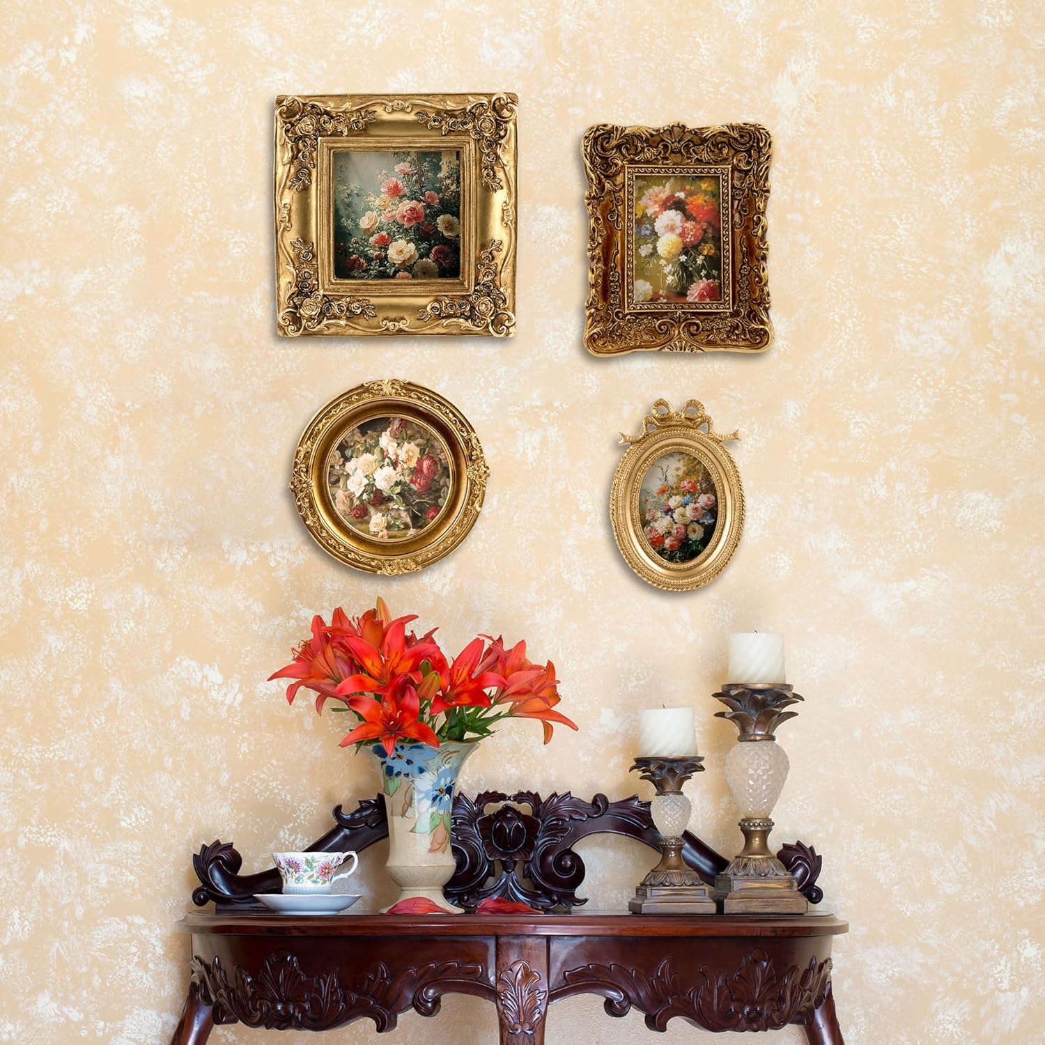 Set of 4 Small Vintage Photo Frames - Gold Ornate Antique Picture Frames for Wall Hanging & Tabletop Display, Mixed Sizes: Round & Rectangle Home Decor (5.7"x4.7", 5.5"x5.5", 3.7"x5.3", 6.3"x6.3")