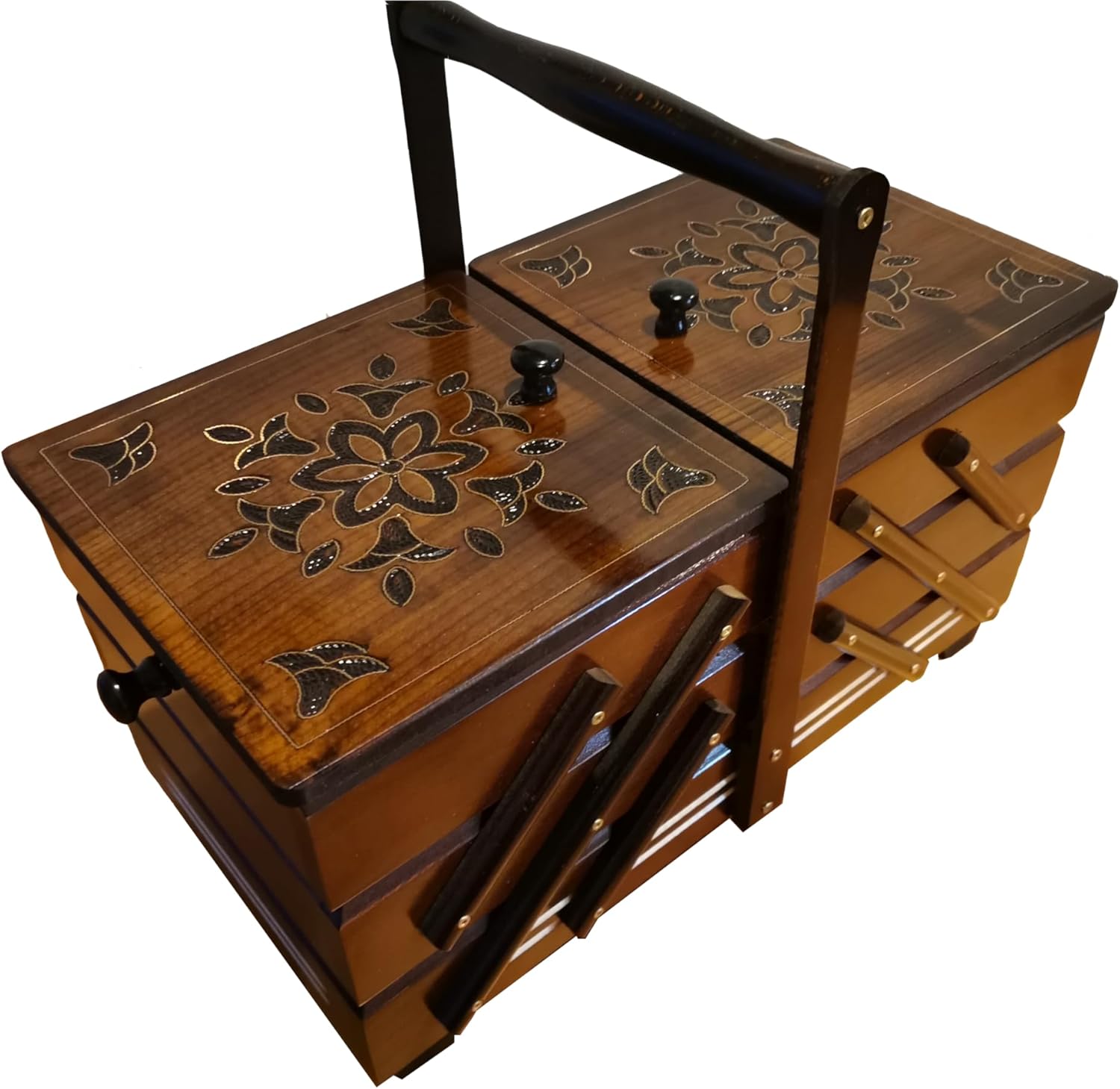 This is a large wooden sewing box, a handmade storage solution for crafters. It is a beautiful and elegant way to keep your sewing supplies organized and easily accessible. The box is made of high-quality wood. It has a spacious interior that can accommodate a wide range of sewing supplies, including scissors, needles, threads, and other accessories. The box also has multiple compartments that help you keep everything neatly sorted and organized. The top of the box features a lift-up lid that provides easy access to your supplies and keeps them secure when not in use. This handmade sewing box is not only functional but also a beautiful addition to your craft room or workspace. It would make a thoughtful and timeless gift for any crafter in your life. With its fine craftsmanship and organizational elegance, it is sure to become a cherished item for years to come.