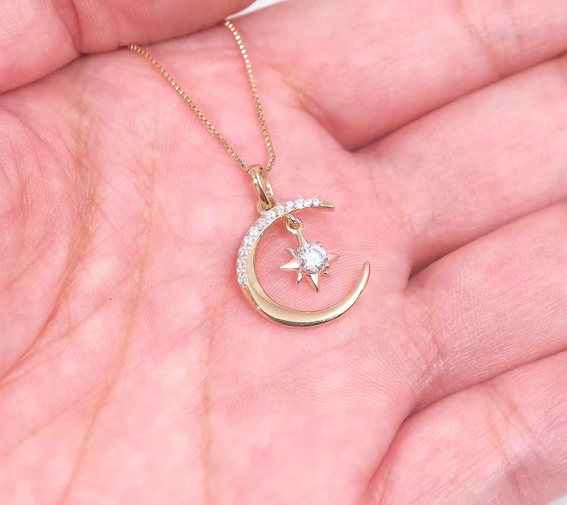 About SISGEM JEWELRY: SISGEM JEWELRY was born to provide a favorite jewelry for every women. A Gift for Yourself: Expecting that SISGEM jewelry make your heart sing every time you wear them and that speaks to your core. A Great Gift Idea for Her: Anniversary Birthday Graduation Valentine’s Day Thanksgiving Day Date It Will Be A Beautiful Story Between YOU and HER. Product Material:14 karat goldWhite diamond Measurement:Moon: 14 mm * 15 mm Package Includes: 1x 14k gold moon necklace1 x Box Caring for your jewelry: 1. Separated it from hard items to prevent scratches and store it in a fabric-lined jewelry box or pouch. 2. Do not expose to harsh chemicals such as cosmetics, hairsprays, perfumes, chlorinated water. 3. To clean gold jewelry, use warm water, a mild soap, and a soft bristled brush if needed.