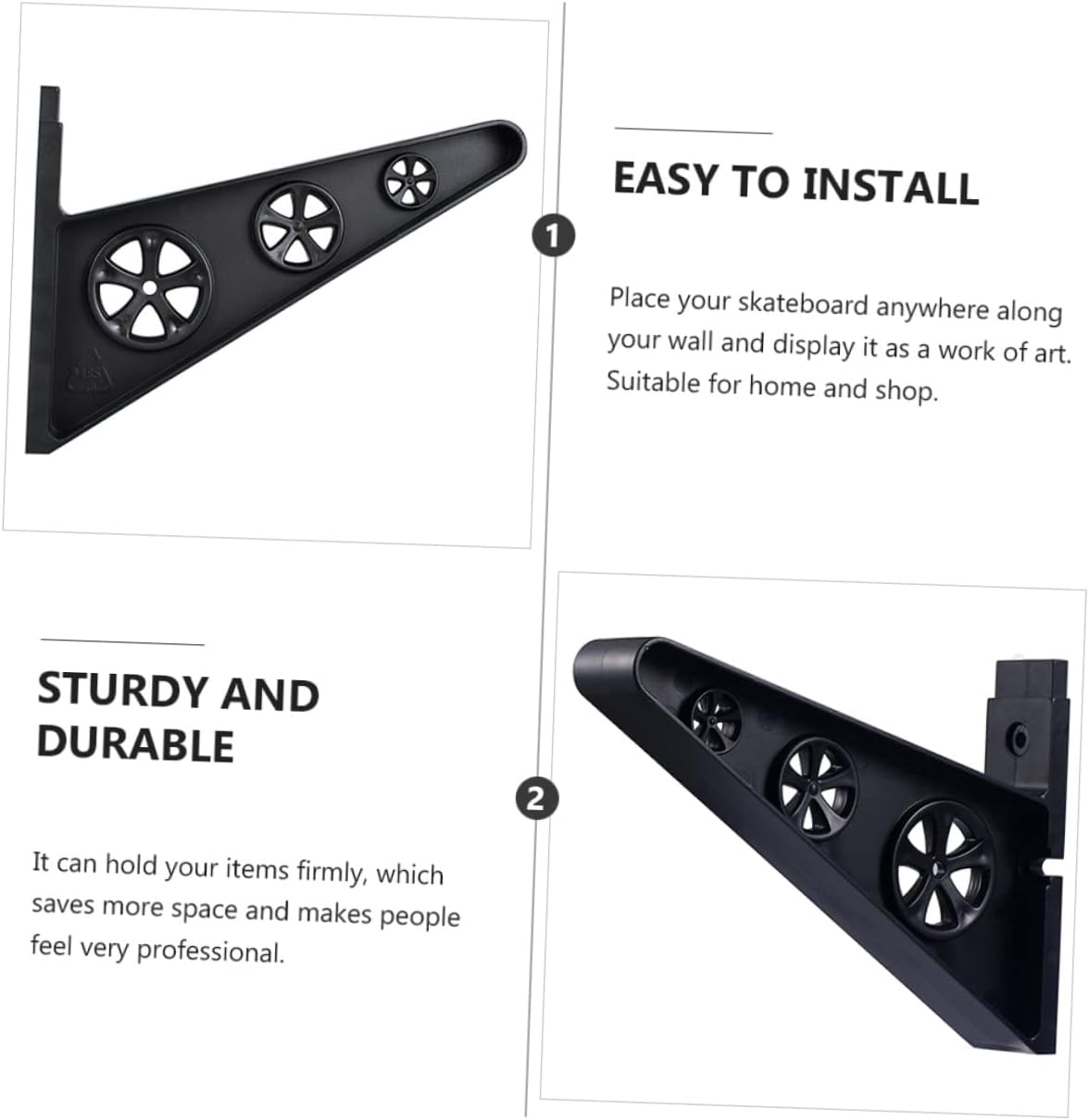 Package List 6 x Skateboard Storage Racks Characteristics - Color: Black skateboard bracket. - Material: PP display stand. - Size: About 22.00X19.00X4.00cm/8.65X7.47X1.57inch wall mount storage rack. - It is easy to install but not easy to fall off wall mounted skateboard rack. - It can hold your items firmly, which saves more space and makes people feel very professional while maintaining the elegance of your showroom multi wall rack. - Made of , it is sturdy and durable for use storage wall mount. - Place your skateboard anywhere along your wall and display it as a work of art. Suitable for home and shop storage shelf. - Great for skateboard, snowboard, helmet, baseball bat, etc skateboard holder.Goods Descriptiondisplay stand It is one of the choices for you.storage shelf Are you looking for a professional, yet wall storage rack? Are you in search of a sturdy, trustworthy tool that can do multiple jobs at once? , ! Our professional wall storage rack must meet you needs