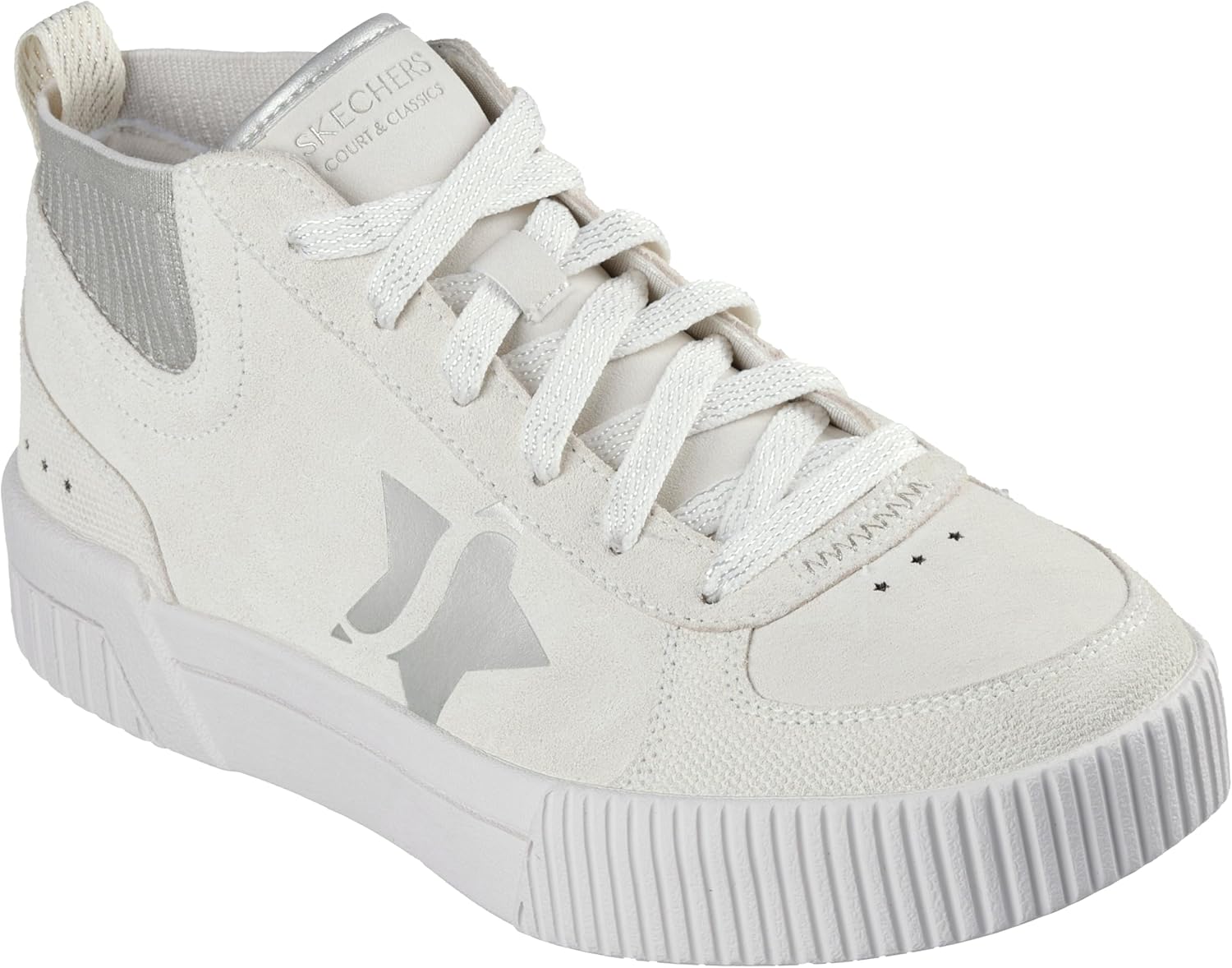 Step into style and comfort with these Jade Soft Sparkle Mid-Top Sneakers featuring memory foam shoes for women technology. These premium casual sneakers showcase a genuine suede upper adorned with eye-catching metallic star underlays and a sophisticated metallic knit collar. The Air-Cooled Memory Foam cushioned comfort insole ensures all-day support, while the flexible traction outsole provides reliable stability. Perfect for those seeking memory foam womens shoes that blend fashion with functionality.