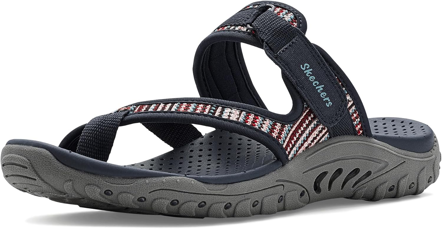 Walk the trails in colorful style and comfort with Skechers Reggae - (Toe Loop). This toe loop sandal features a leather and multicolor web fabric upper with an adjustable strap.