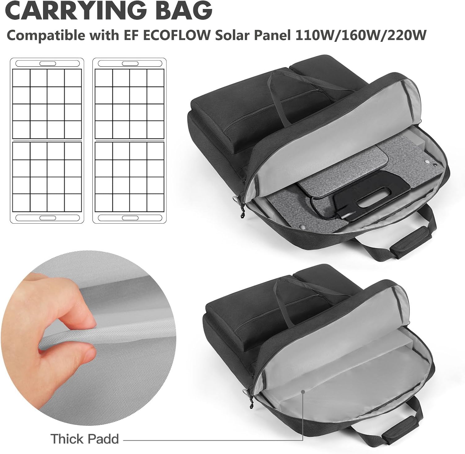 PRODUCT SPECIFICATIONS Product Type: Travel Bag Compatibility: Compatible with EF ECOFLOW Solar Panel 110W/160W/220W Color: Black Package Includes: 1 x Solar Panel Storage Bag