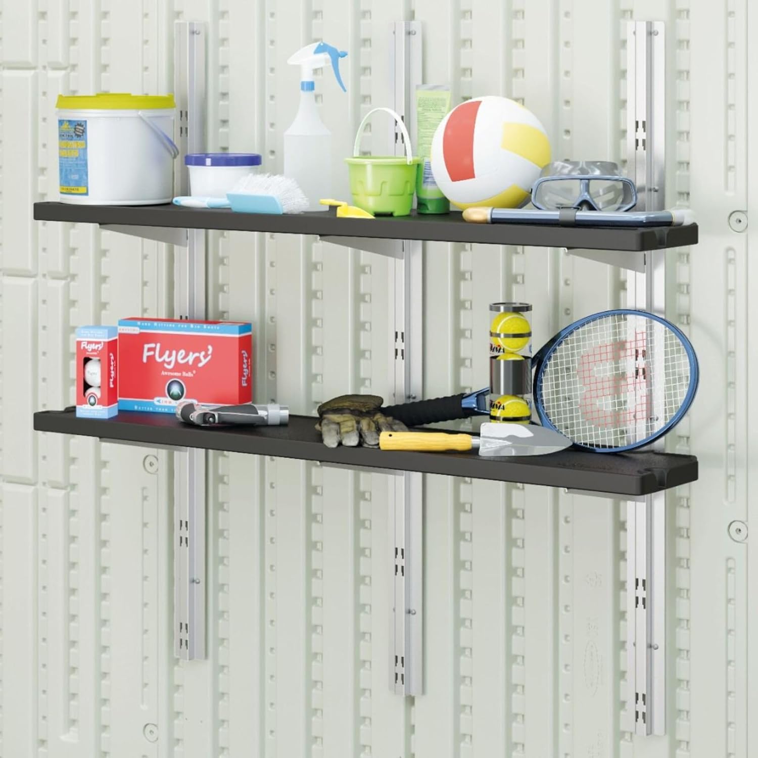 | Assembly Instructions Description | The Suncast Vertical Shed 2 Shelf Kit includes a steel reinforcement bar and screws for secure wall mounting. Follow these steps to assemble and install your shelves: 1. Identify the desired mounting height using the six available positions. 2. Mark the wall where the reinforcement bar will be placed. 3. Secure the reinforcement bar to the wall using the provided screws. 4. Place the shelves onto the reinforcement bar, ensuring they are level and securely in place. 5. Test the stability of the shelves by applying gentle pressure. 6. Organize your items on the shelves, ensuring the weight is evenly distributed to support up to 50 pounds per shelf. |