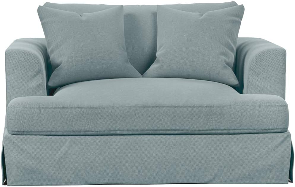 Sunset Trading Newport slipcovered T-cushion oversized armchair is designed for maximum comfort and durability. From your country family room to a seaside beach house, every living space can be updated in style with this chair and a half, featuring contemporary rounded recessed wedge arms for a designer look. The extra room provided by this deep seating large accent chair allows two people to snuggle comfortably, while single users have more space to spread out and relax on the gentle sloping curve of the padded shelter arms. Are your pets napping, kids playing and family hanging out eating and sipping on your living room furniture? You will love that this lounge chair is completely covered with removeable slipcovers which feature spill and stain repellent technology to keep the fabric looking clean, just wipe up spills with a paper towel. Comfy feather foam cushions are the same on both sides to flip and minimize wear and the two throw pillows can be used anywhere. Your search for ideas to update your home can end here when you pair with matching sofa, ottoman, and slipcovered dining chair.