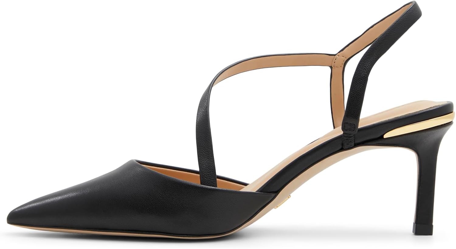Pia is the sophisticated finish your outfit needs, featuring a sleek pointed toe and slingback straps with a crossover design. These court style shoes have a mid heel that makes them oh so wearable, which is embellished with shiny hardware at the back to leave a lasting impression.