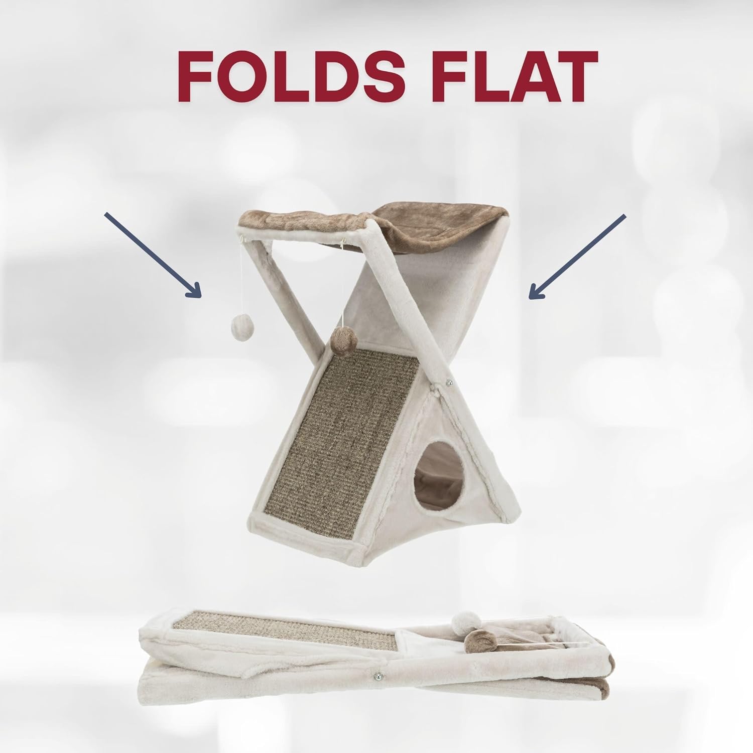 The unique design of TRIXIE's Miguel Fold and Store Cat Hammock makes it ideal for small spaces. Simply fold shut for quick and easy storage. While in use, it will provide endless opportunities for cats to play, explore, scratch or just relax. Felines can sharpen their claws on the durable sisal scratching surface instead of on your furniture or carpet, giving them a healthy outlet for their scratching instincts. Spunky cats can jump, climb or perch in the plush hammock and lie in wait for unsuspecting prey or just relax and enjoy the view. For a cozy retreat, they can crawl inside the soft sided condo with a plush insert. Suitable for cats of all ages and activity levels. Dimensions - Scratching pad: 16" x 10"; Condo opening: 7" diameter.