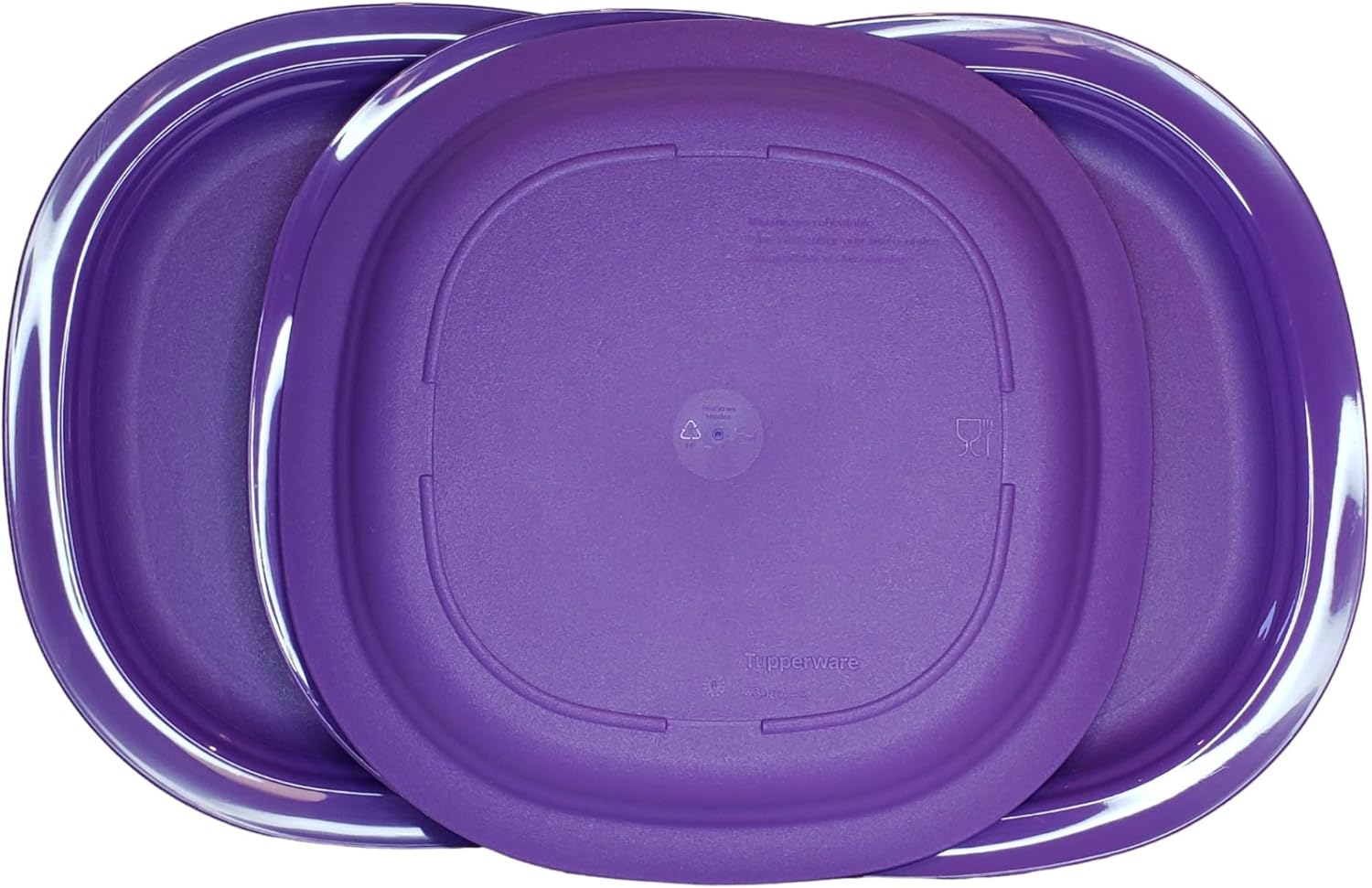 Tupperware Microwave Reheatable Luncheon Plates in Purple - Set of 4 plates measuring 9.5 inches square are microwave safe to max 600W for up to 2 minutes at a time. Lightweight and durable these plates are great for kids, picnics, and outdoor meals. Specially designed footed base allows for even airflow in the microwave. Dishwasher safe and BPA free.