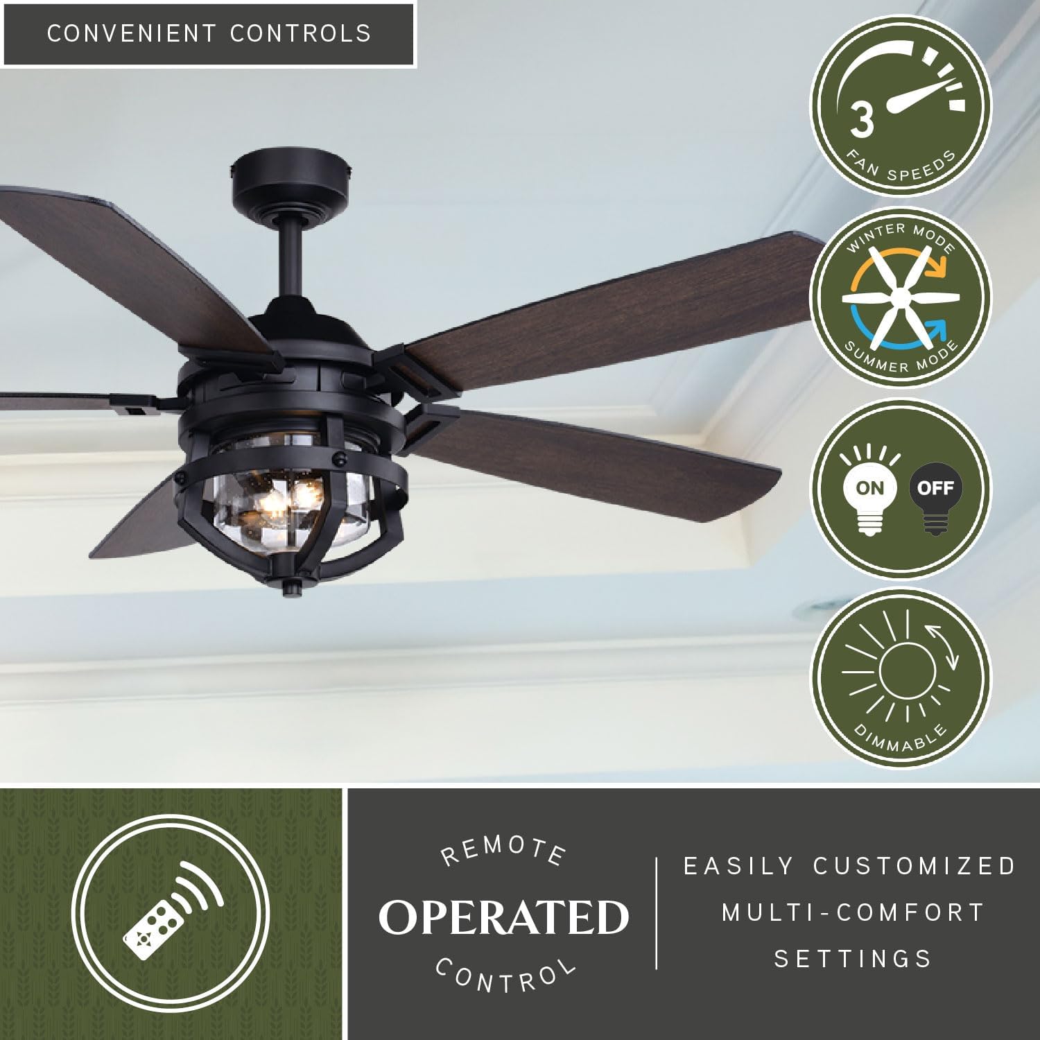 Farmhouse styling gives the Barnes 54-in. ceiling fan a unique twist on an old favorite. The matte black cage surrounds a clear seeded glass shade. Five reversible blades in black chestnut or regular chestnut finish create an industrial feel. Vintage Edison style filament bulbs complete the look. Wet rated for indoor and outdoor spaces, this farmhouse fan is ideal for many areas including great rooms, living rooms, and outdoor areas.