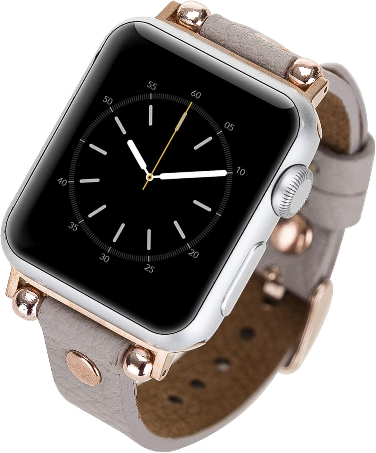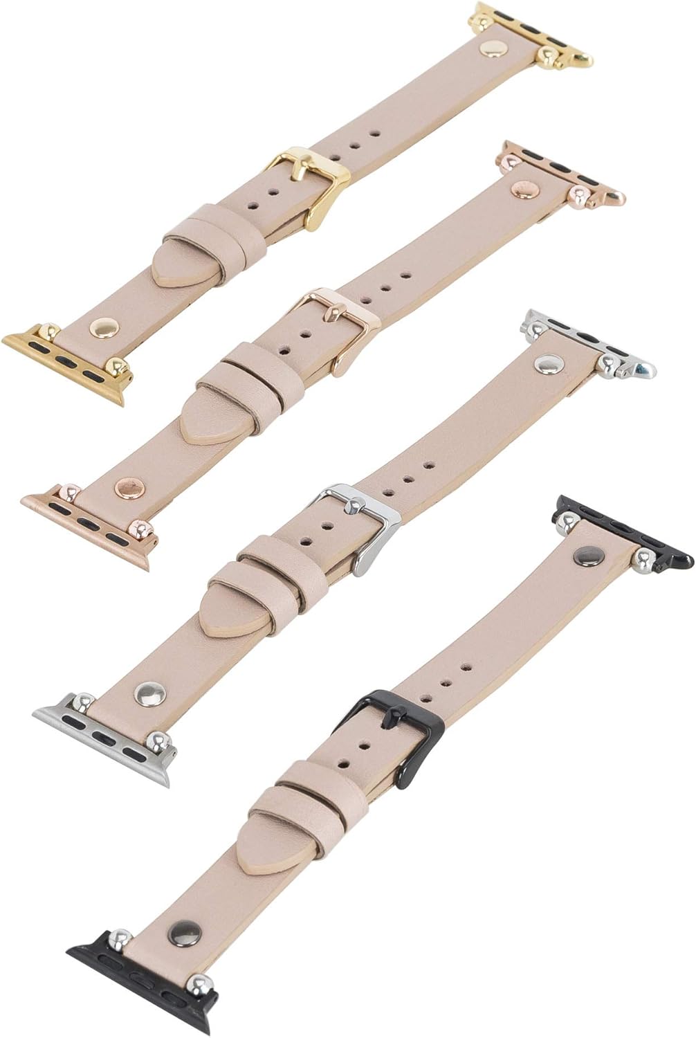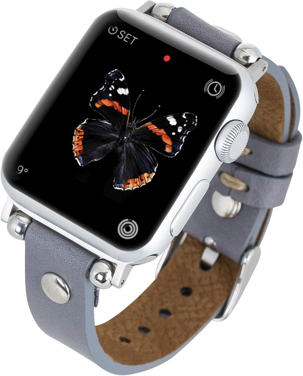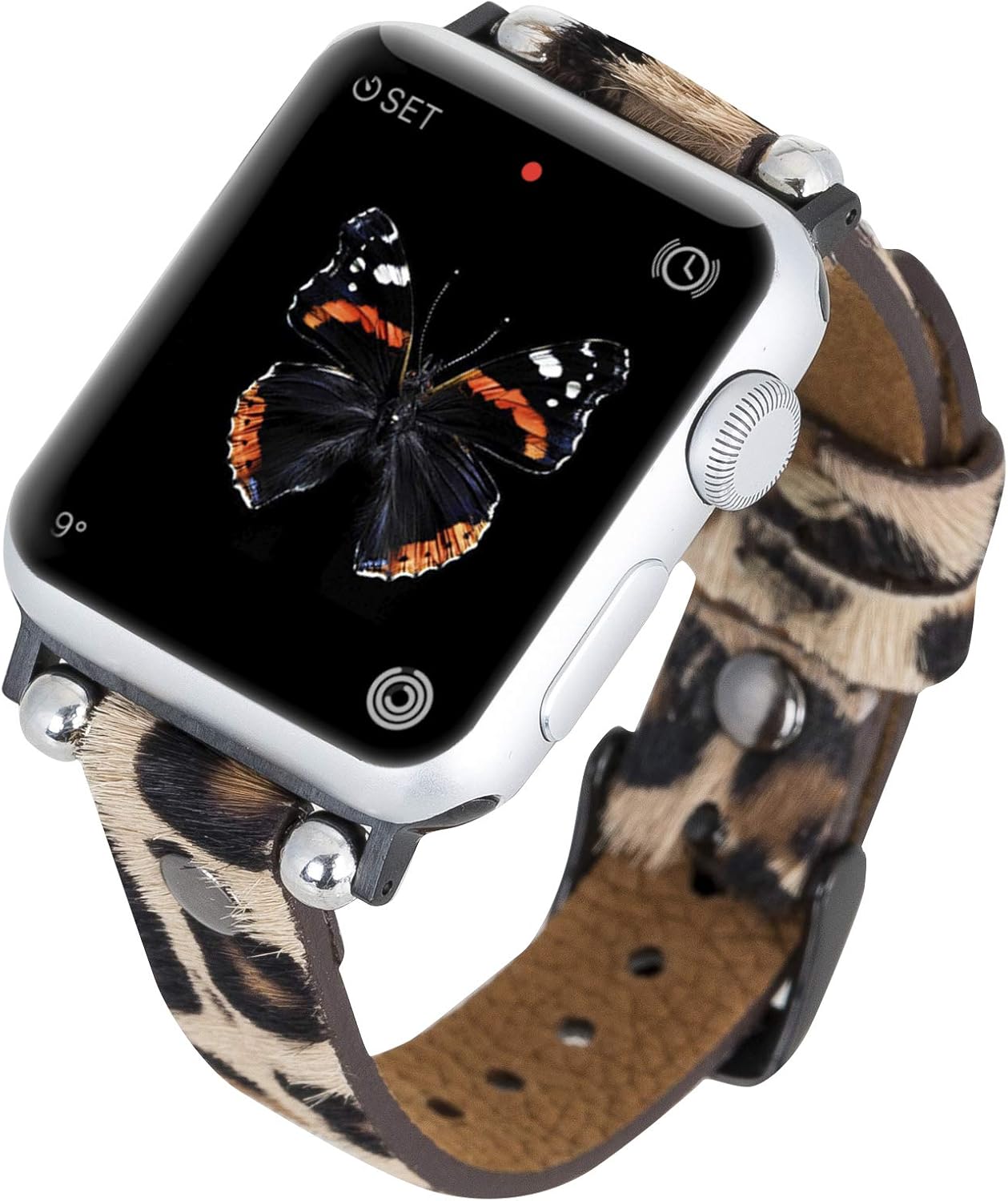 NEW (SLIM CUT DESIGN) GENUINE FULL GRAIN PREMIUM LEATHER APPLE WATCH BAND EMBELLISHED WITH STUDS COMPATIBLE WITH APPLE WATCH SERIES 1,2,3,4,5,6,7,SECOMPATIBLE APPLE WATCH DIMENSIONS - Perfectly fits ALL 38mm, 40mm, 41mm, 42mm, 44mm, and 45mm Models (Apple Watch & Sport & Edition Version) PLEASE SELECT YOUR CORRECT APPLE WATCH SIZE (38-40mm) or (42-44mm) FROM THE CHARTAVAILABLE IN VARIOUS COLORS -Black, Antique Brown, Nude Pink, Red, Purple, White, Leopard Pattern, Gray, Furry LeopardGENUINE HANDMADE LEATHER - Handcrafted from soft full grain genuine leather with a unique texture, this luxurious accessory boasts a simple, classic buckle closure, making it super comfortable and adjustableAGED BY YOUR INDIVIDUAL LIFESTYLE - Sourced from top-class tanneries in Italy and Turkey, the Vintage Venito will come to life as the leather ages over time, creating a patina unique to youDURABLE LINEN STITCHING TO ENSURE LONGEVITY AND DURABILITY - Stitched to perfection with a stronger suture, each strap is reinforced with durable linen thread and a soft leather backingCHOOSE A STAINLESS STEEL HARDWARE COLOR - Choose from Silver, Black, Gold or Rose Gold Stainless Steel HardwareEXCEPTIONAL CRAFTSMANSHIP - This is a unique and very special item. An exceptional timeless gift for men and women smartwatch loversEASY INSTALLATION - Quick and easy installation. Slid in - Slid out installation. No additional tool is requiredCOMFORTABLE TO WEAR - One size band fits wrists from 5.5"-8.0" (140-200mm)A PERFECT GIFT IDEA - Comes in an elegant package