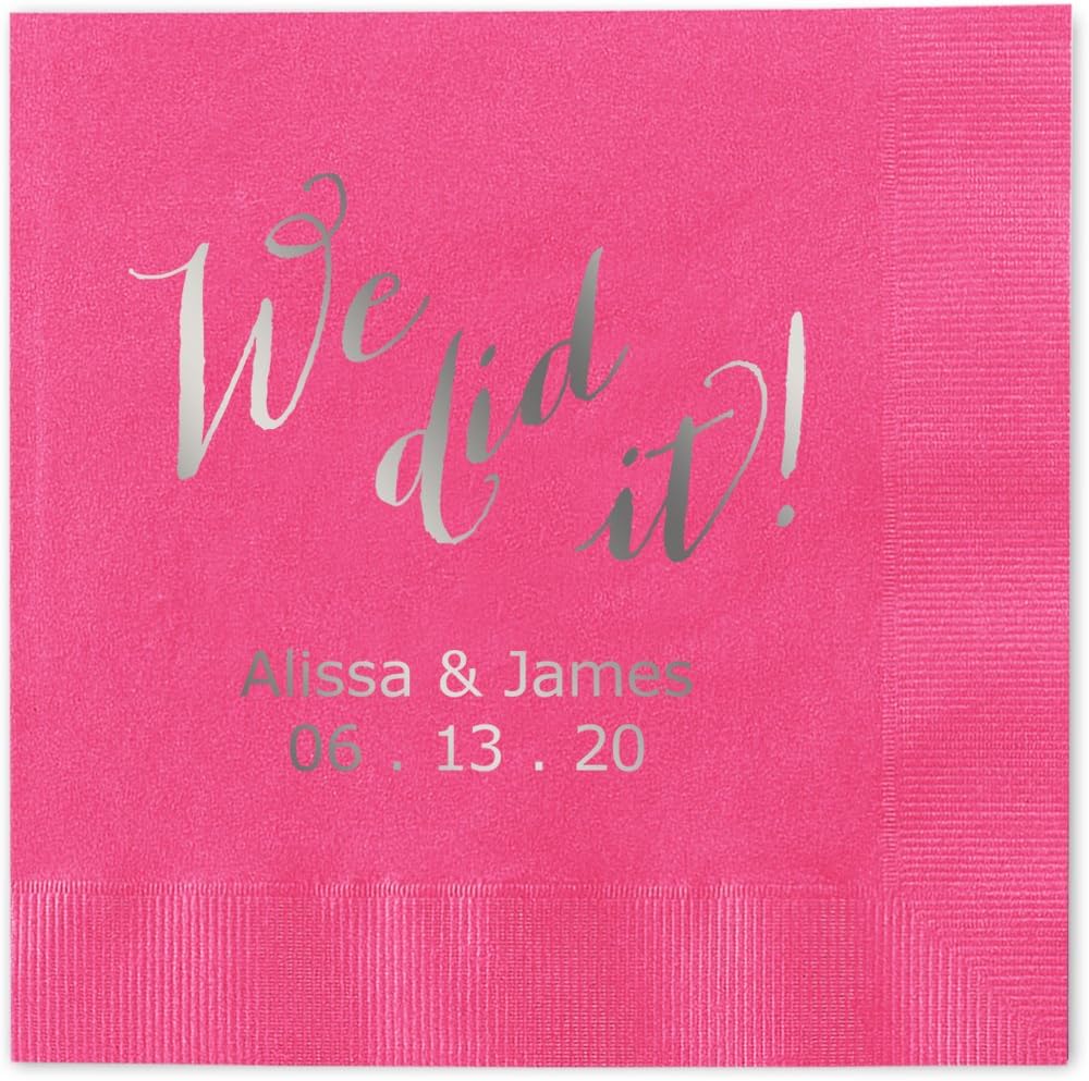 Navy blue personalized cocktail napkins are custom printed in your choice of one foil color and font. These square 4 3/4 inches by 4 3/4 inches 3-ply napkins can be personalized for a an engagement party, a wedding reception, an anniversary event, a housewarming party, or other special occasion. Be sure to order plenty of napkins for your event! We recommend an estimate of 2 to 3 napkins per person.
