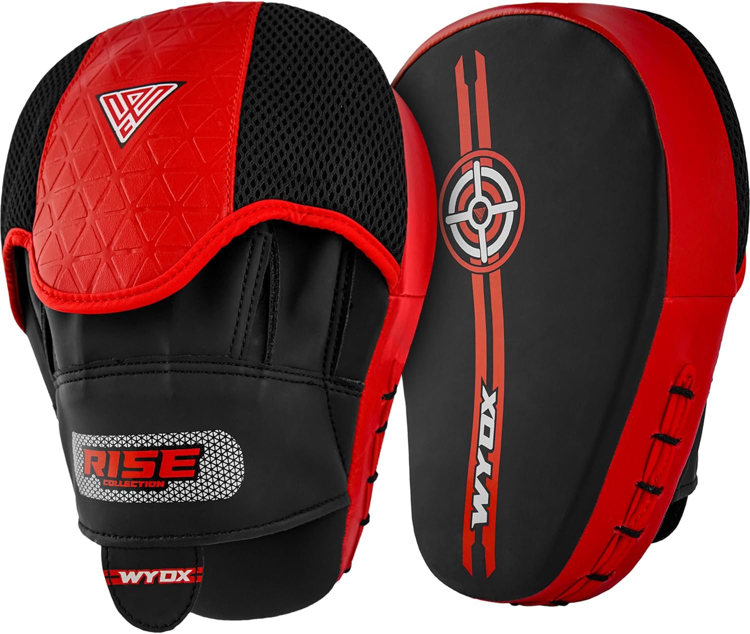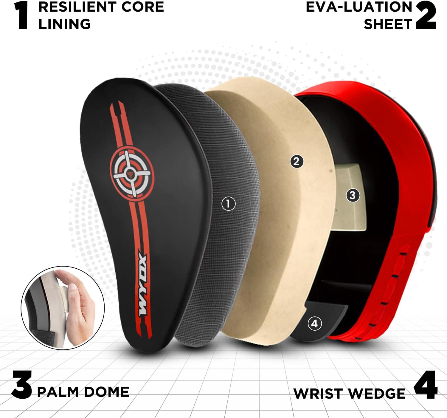 The WYOX Focus Pads & Hand Wraps Bundle is designed to take your boxing, kickboxing, MMA, Muay Thai, and martial arts training to the next level. The curved focus pads are built with high-density foam that absorbs impact effectively, helping athletes refine their striking power, accuracy, speed, and reflexes. With a lightweight build, non-slip grip, and breathable design, they offer comfort and control for both trainers and athletes, making them perfect for home workouts, gym training, or partner drills. Paired with 180-inch elasticated hand wraps, this set provides maximum support for wrists, knuckles, and palms during training. Made from a durable cotton-nylon blend, the wraps feature a secure hook-and-loop closure and an ergonomic thumb loop for easy use and stability. Breathable and flexible, they keep hands comfortable while delivering lasting protection through bag work, sparring, or pad training. Together, these focus pads and wraps create a complete, reliable training solution for beginners, fitness enthusiasts, and experienced fighters alike.