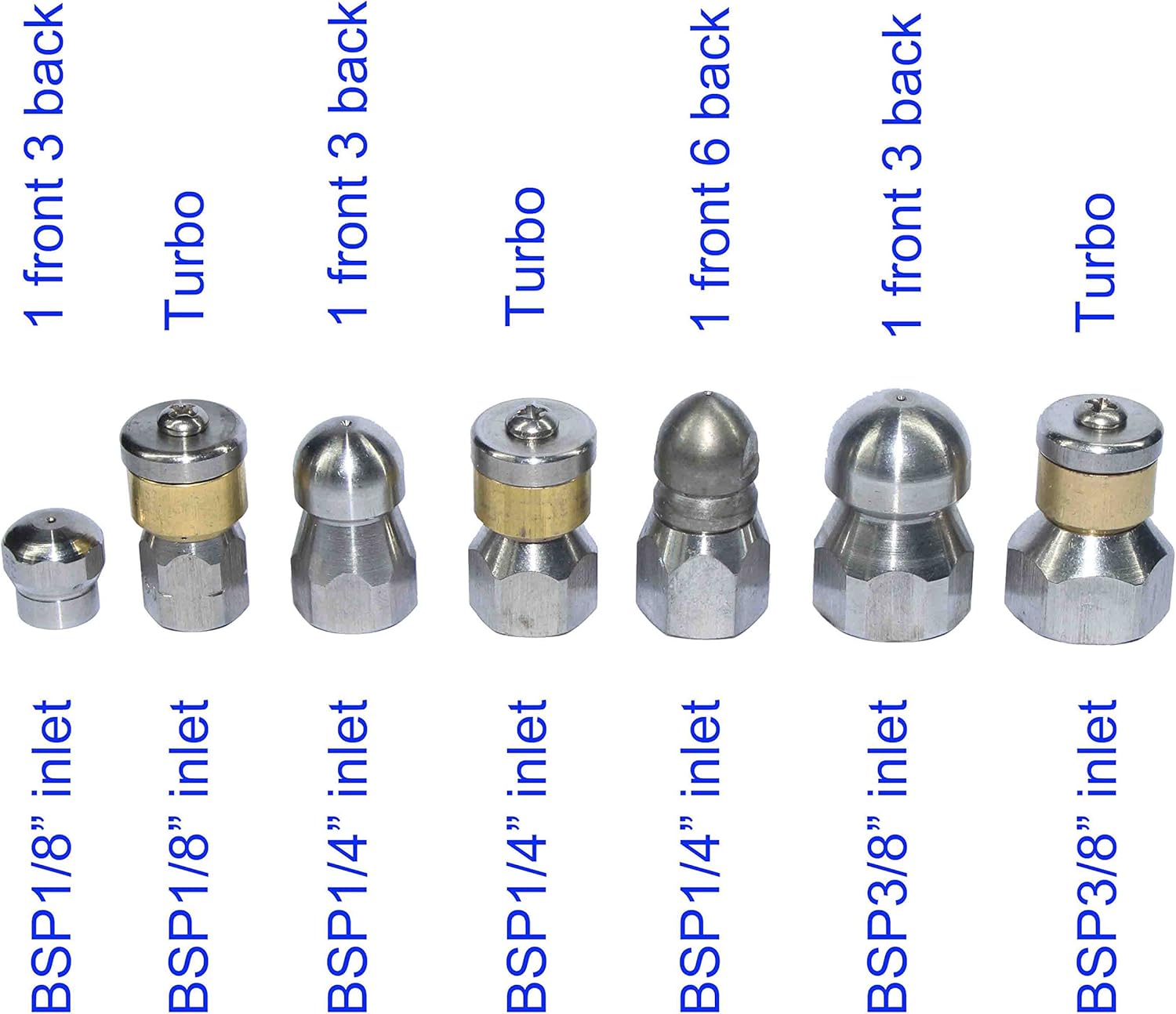 Stainless Steel Button Nose 1/4" Female Sewer Jetter Nozzle 4000 PSI S13-1/8" female: 1 front 3 rear Turbo-1/8" female S13-1/4" female: 1 front 3 rear S16-1/4" female: 1 front 6 rear Turbo-1/4" female S13-3/8" female: 1 front 3 rear Turbo-3/8" female 4000 PSI Max Pressure water up to 310° F High Strength Stainless Steel