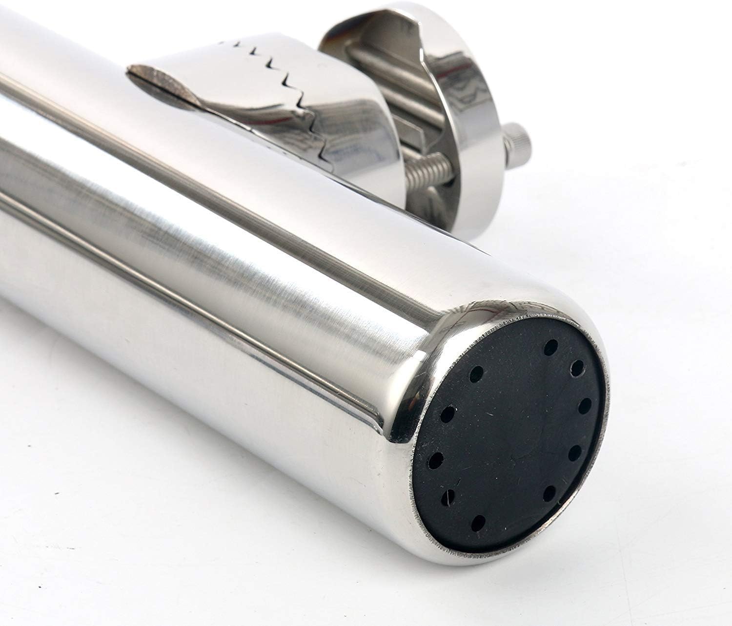 YaeMarine 4Pcs Stainless Steel Rod Holder Boat Stainless Clamp on Fishing Rod Holder for Rails 7/8" to 1" or 1" to 1-1/4" Specifications ▪ Material : 304 Stainless Steel ▪ Length : Approx. 23cm/9inch ▪ Inner Diameter : Approx. 1-5/8inch ▪ Clamp Range : Approx. 22mm-25mm(7/8" to 1") or 25mm-32mm(1'' to 1-1/4'') ▪ Color : Silver & Black ▪ Package Includes : 4 x Stainless Steel rod holders and a wrench Features ▪ Made of quality stainless steel. Durable, anti-rust, could provide you a long service life; ▪ Stainless Boat Rod holder can be adjusted to 32 different angles when mounted; ▪ Rubber insert could protect your fishing rod from scratches; ▪ Drain holes could let the water flew out freely;