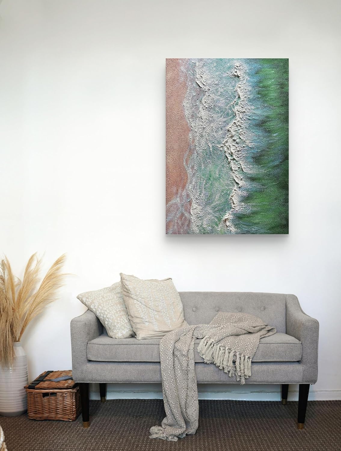 Transform Your Space with the Rhythm of the Ocean Immerse your walls in the dynamic beauty of the coast. This original handmade painting captures the raw energy and tranquil beauty of the seashore, where vibrant green waters meet crisp, white crashing waves. It's more than just wall decor; it's a feeling of serene power for your home. Key Features & Benefits: · Authentic Handmade Craftsmanship: Every piece is individually created by hand. The rich, textured landscape is built up using a palette knife and high-quality acrylics, resulting in a tangible, three-dimensional artwork you can see and feel. · Effortless Elegance, Ready for Your Wall: We believe in a seamless experience. Your new focal point arrives ready to hang right out of the box, with all hardware included. Unpack, place, and enjoy your transformed space in minutes. · Superior, Long-Lasting Materials: We use fade-resistant acrylic paints on a durable canvas to ensure the vibrant colors and striking textures remain as captivating as the day you received it. · Versatile Design for Any Room: The modern coastal theme and sophisticated color palette make it a perfect fit for various settings. · Living Room: Creates a stunning backdrop behind your sofa. · Bedroom: Establishes a calming and relaxing atmosphere. · Office: Adds a touch of inspiration and elegance. · Entryway: Makes a powerful first impression on guests. Product Details: · Theme: Seascape, Ocean Waves, Coastline · Style: Modern Coastal, Textured Abstract, Impasto · Primary Colors: Deep Sea Green, Bright White · Material: High-Quality Acrylic Paint on Canvas · Dimensions: 70 x 100 cm (approximately 28" x 40") · Special Features: Handmade, Heavy Texture, Pre-installed Hooks Invest in a piece that does more than decorate a wall—it evokes an emotion. Add to Cart today and let the tides of creativity wash over your home.