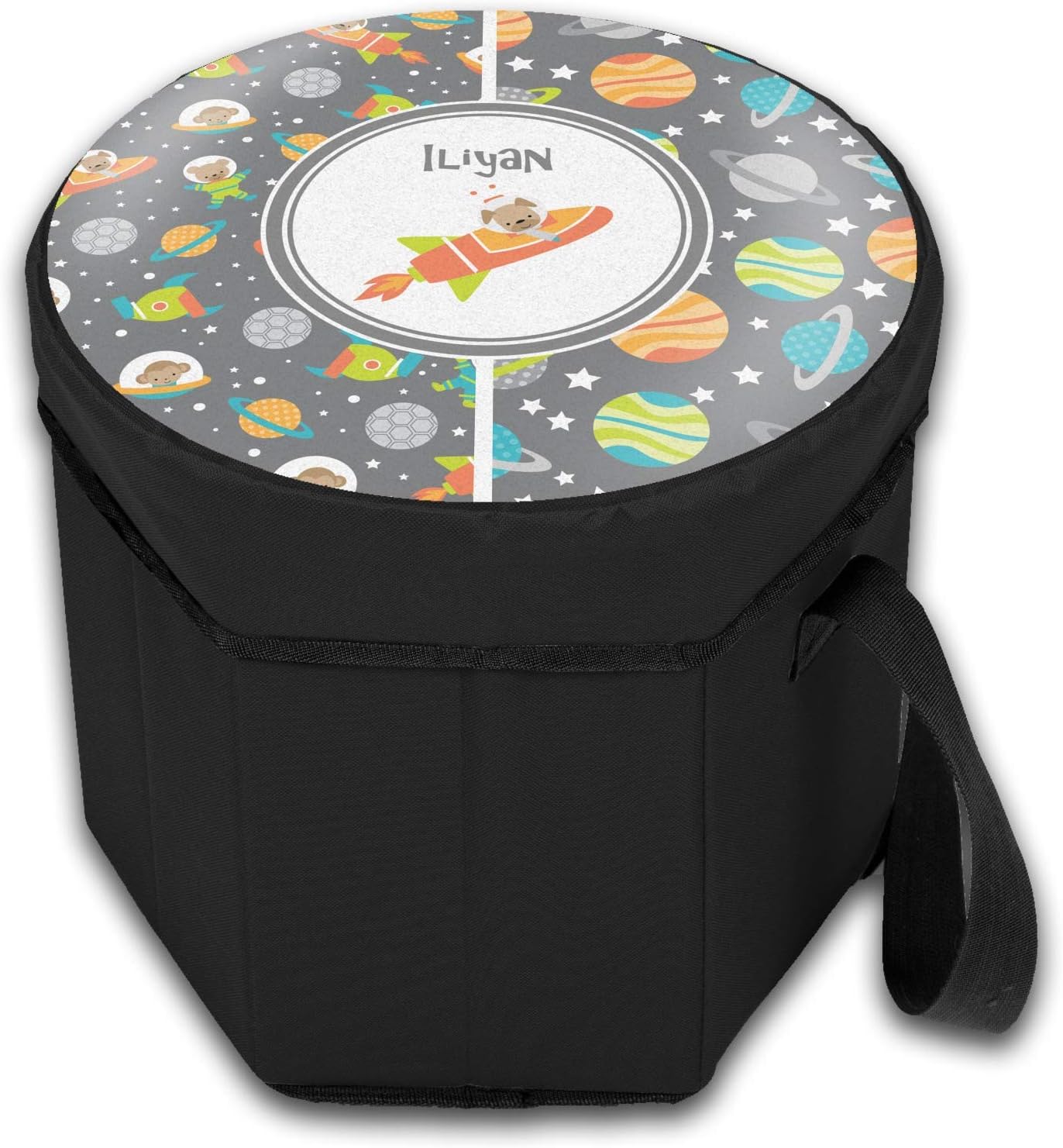 Our collapsible insulated coolers feature a unique six-sided hexagon shape, are lightweight, durable and can be turned into a seat. This cooler is fully insulated with silver foil lining to keep food and drinks hot or cold, and has a 12-quart capacity. Although this cooler collapses for easy transport, hidden inside are composition panels made of sturdy wood that give the frame strength and allow this cooler to be used as a seat. Simply sit down on the personalized cover and give your legs a break! (Maximum weight capacity of 200 pounds.)For easy storage when not in use, remove the bottom insert and fold the cooler flat. The adjustable shoulder strap makes for easy transport.Design Shown: Space Explorer (#1044817)Features:==================================== * [Unique Hexagon Shape]: Six-sided design offers a stylish and functional cooler. * [Versatile Functionality]: Doubles as a seat with a 200 lbs max weight capacity for added convenience. * [Insulated Interior]: Silver foil lining keeps food and drinks hot or cold, with a 12-quart capacity. * [Easy Transportation]: Features an adjustable shoulder strap with pad and collapses for effortless storage.Care Instructions:==================================== * Untwist lid * Remove inner piece * Hand wash with warm water or mild detergent * Air dry