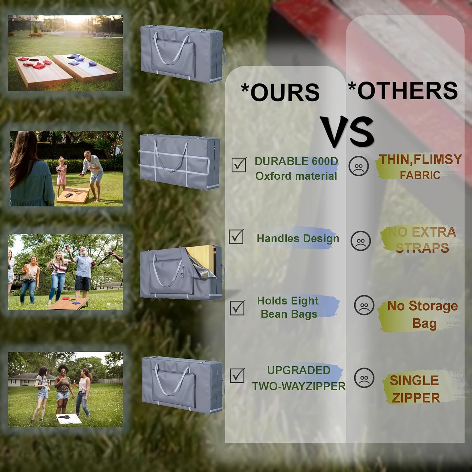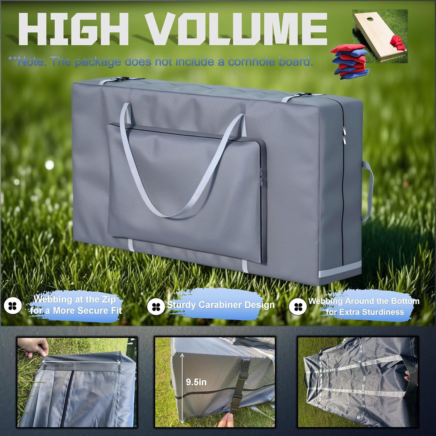 This heavy-duty cornhole carrying case is the perfect solution for transporting and protecting your regulation-size cornhole boards. Designed to accommodate two standard 4' x 2' cornhole boards, this spacious bag measures 49 inches by 25 inches by 10 inches, providing ample room for your game equipment. Constructed from robust 600D Oxford fabric with PVC waterproof and UV-proof coatings, this case offers superior tear resistance and weather protection for your boards. The durable material shields your cornhole boards from rain, sun damage, and everyday wear and tear, ensuring they stay in excellent condition season after season. while convenient exterior pockets provide extra storage space for cornhole bags and accessories. Dual reinforced handles make carrying comfortable and easy, whether you're heading to a backyard barbecue, tailgate party, or beach outing. The practical design combines functionality with durability, making it an essential accessory for any cornhole enthusiast who wants to keep their boards protected and ready for the next game.