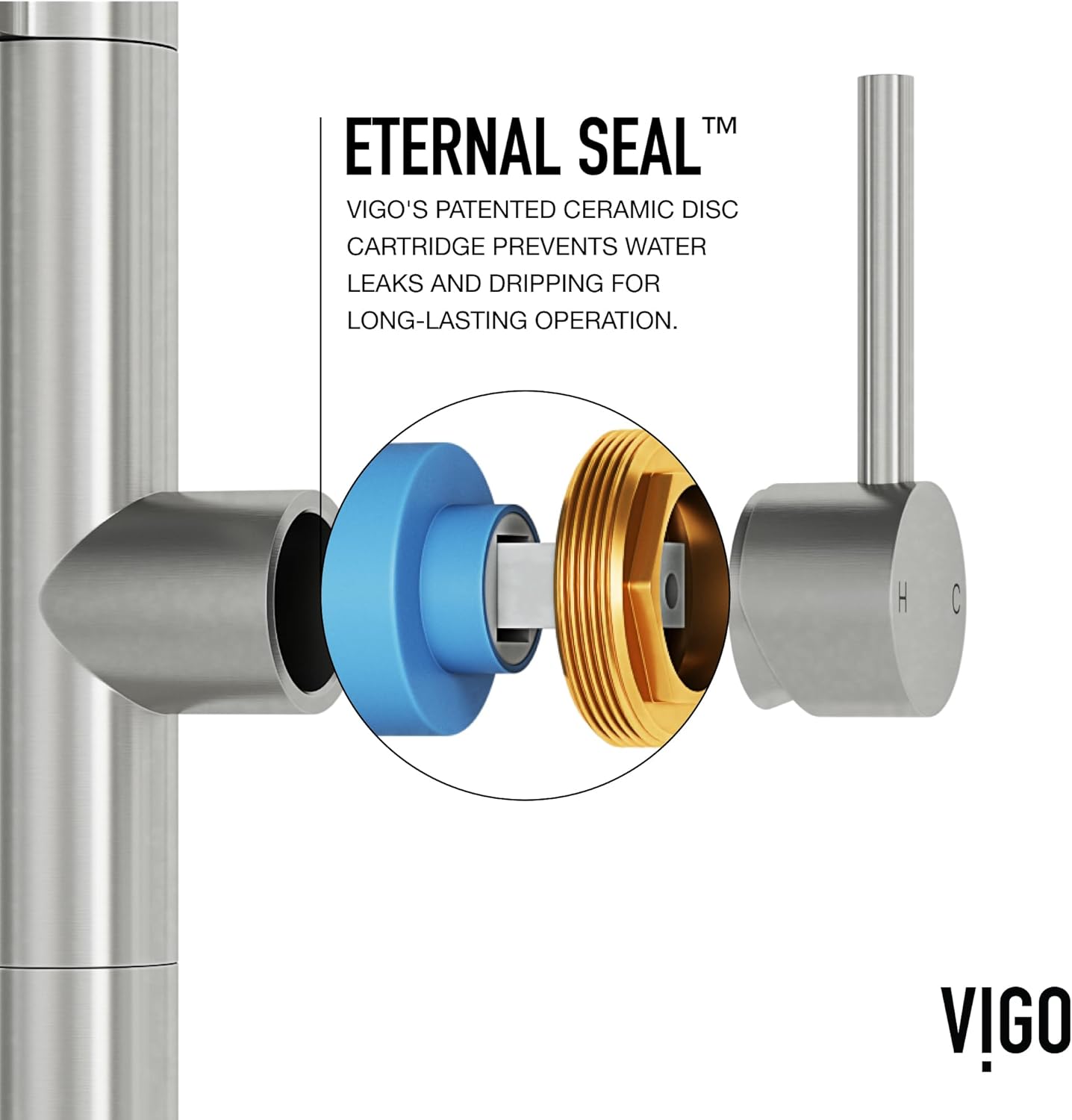 Vigo Vg02052 Features: Covered under Vigo's limited Faucet body constructed of brass Coordinates with products from the Edison line Single hole mounting type Deck mounted faucet installs directly to sink or countertop Pull-down spray Fixed spout will remain in only one position with no movement Single lever handle controls the flow and temperature of water Includes ceramic disc cartridge Mounting hardware included Complies with ADA standards compliant Vigo Vg02052 Specifications: Height: 20" (deck to top of faucet) Spout Height: 7" (deck to spout outlet) Spout Reach: 9" (center of faucet body to center of spout outlet) Flow Rate: 1.8 gallons-per-minute Faucet Holes: Single Hole Faucet Hole Size: 1-3/8" Max Deck Thickness: 1-1/2" (from deck bottom to top of deck)